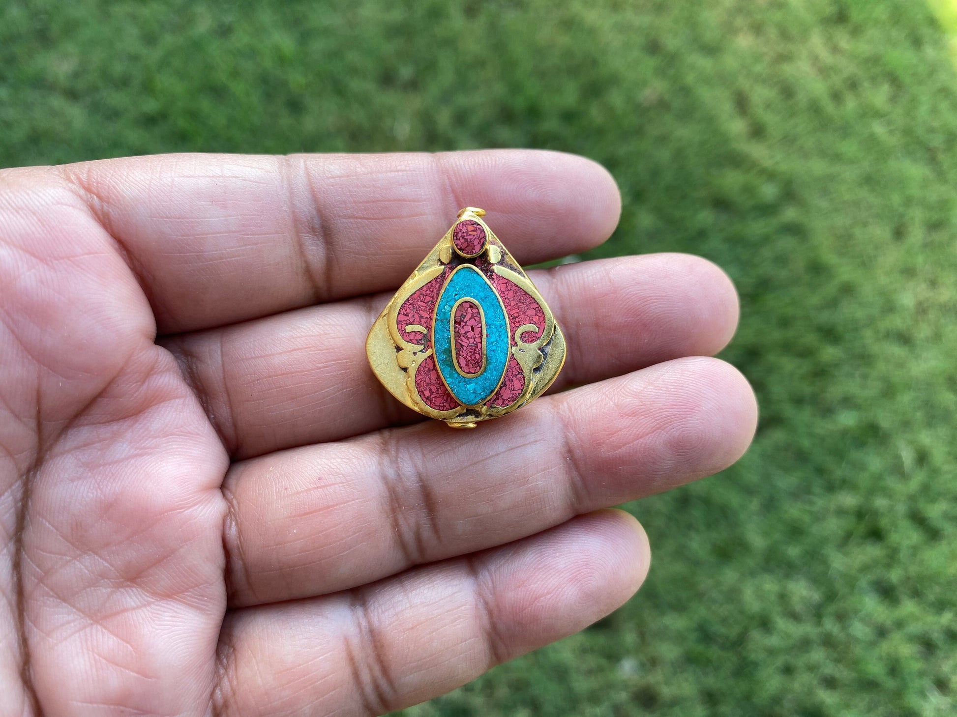 Focal Nepal Bead, High Quality 18k Brushed Gold Overlay Over Brass, Turquoise with Coral Inlay Bead, Handmade Necklace Bead, Earring Charm