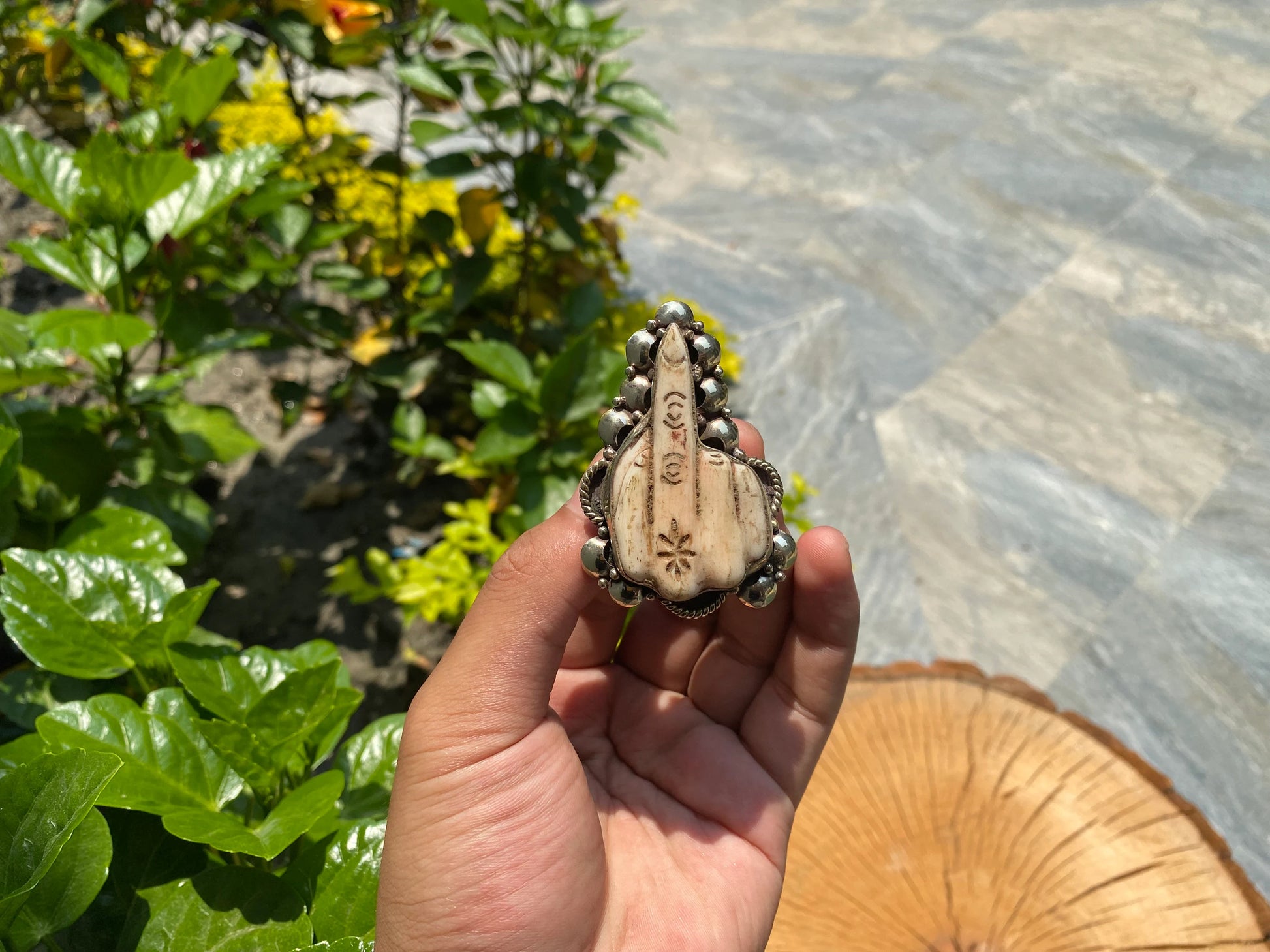 With our Tibetan Silver Ring, which has a Funny Finger carved on a buffalo bone, you may reveal its whimsical charm. This charming piece gives your style a lighthearted touch, and the hammered texture of the silver band makes it even more distinctive. Its customizable design guarantees that everyone will fit comfortably. Embrace the whimsical and unique aspect of fashion with this item.