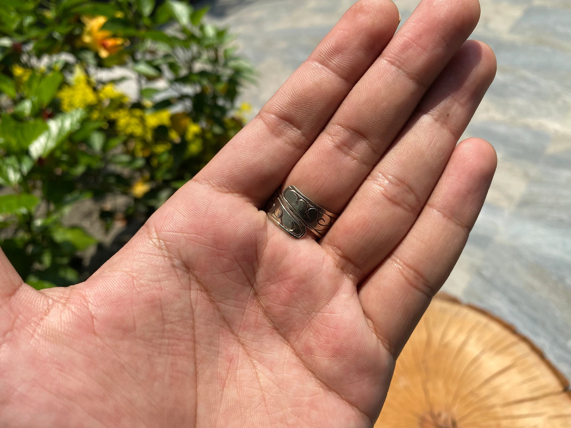 With our Tibetan Silver Ring, which has a Funny Finger carved on a buffalo bone, you may reveal its whimsical charm. This charming piece gives your style a lighthearted touch, and the hammered texture of the silver band makes it even more distinctive. Its customizable...