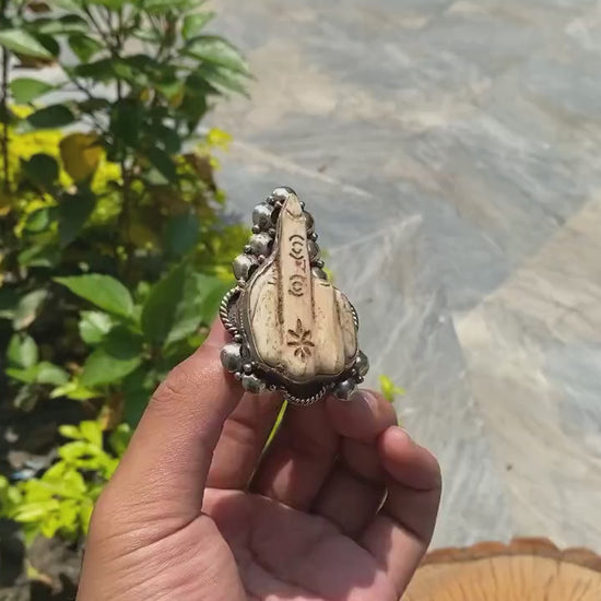 Funny Finger carved on Buffalo bone, Tibetan silver Ring, Adjustable ring, Hammered Ring.