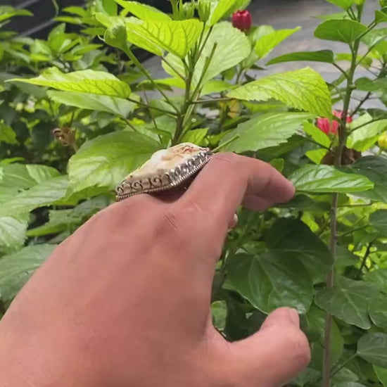 This unusual skull is delicately carved into the water buffalo bone in this Tibetan silver ring, adding a touch of bohemian flair with an edge. Perfect for daily wear, it is unisex in style and helps inject some rebellious spirit into any outfit. Ideal for anyone who loves unique accessories with a cultural twist and a touch of humor.DA-450This listing is for 1 piece.Ring Size: Adjustable (One size fits most) can size up or downMeasurement: Approximately 43.00 mm X 36.00 mm ( From widest Side) , Weight: 26.00 gm