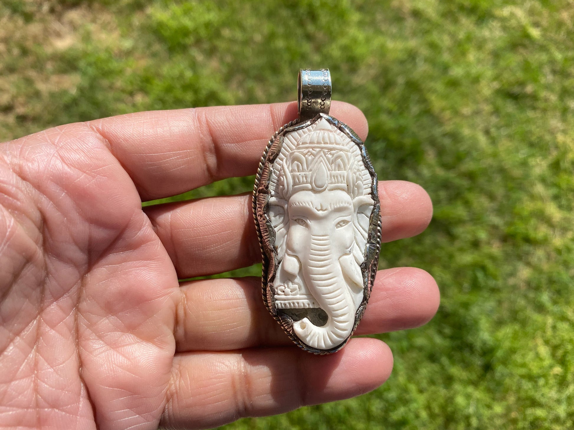 Ganesh Carved Bone Tibetan Silver Pendant, Buffalo Bone, Yoga Pendant, Ethnic Jewelry, Tribal, Spiritual Pendant, Pendant for Men or Women