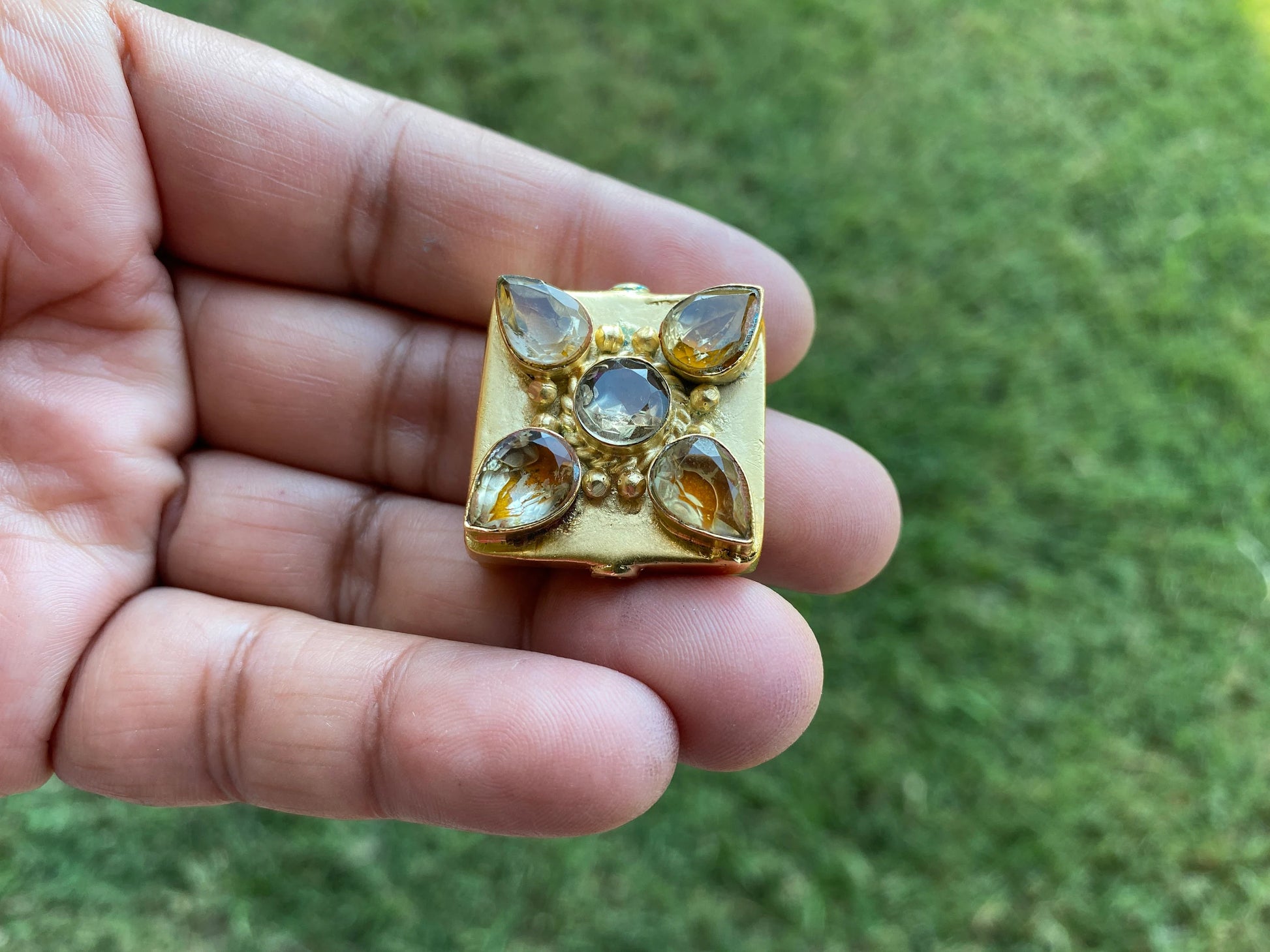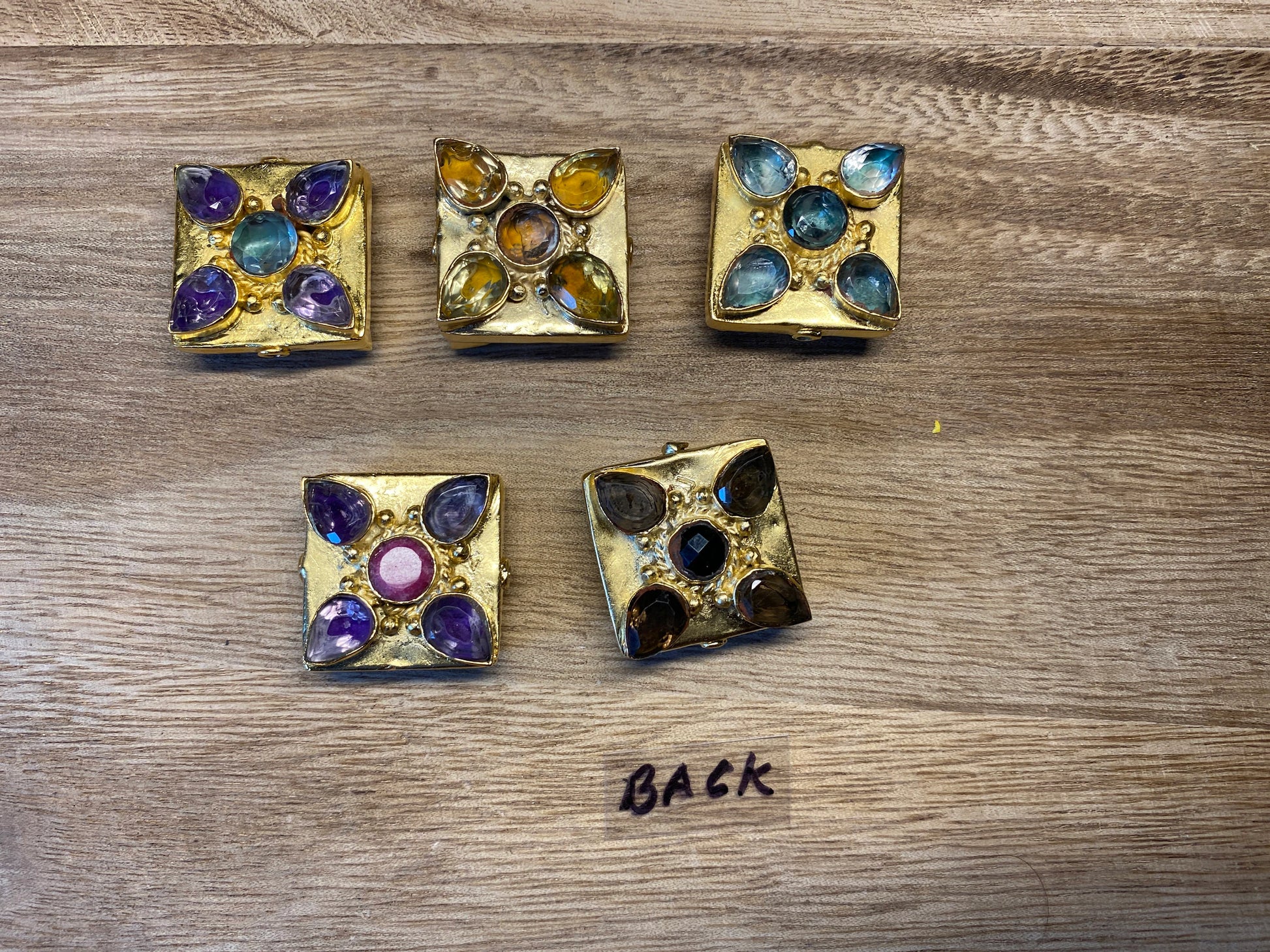 These beautiful high quality 18K Matte Gold Overlay over brass with anti-tarnish finish so that It will not tarnish. These Tibetan beads were handcrafted in Nepal. Hand-carved beads made with Gemstones. These Beads are sure to make an impact on your jewelry project. These beads would be a great addition to your necklace or bracelet project. These beads would look great strung on beaded necklace or Mala.Gemstones:Top Left Beads: Amethyst and Aquamarine GemstoneTop Middle Beads: Citrine GemstoneTop Left Beads: Aquamarine GemstoneBottom Left Beads: Amethyst and Ruby GemstoneBottom Right: Smoky Quartz Gemstone
