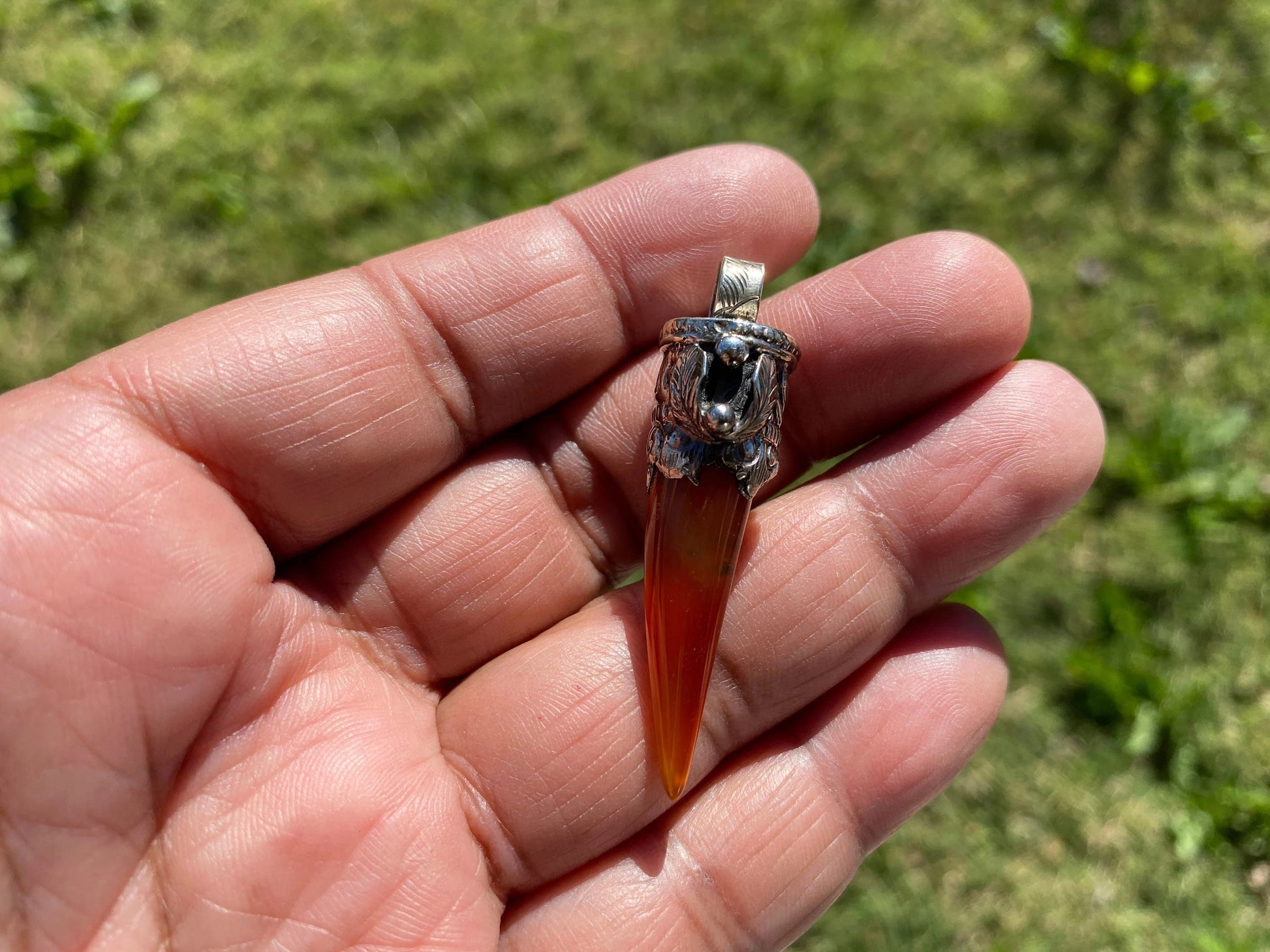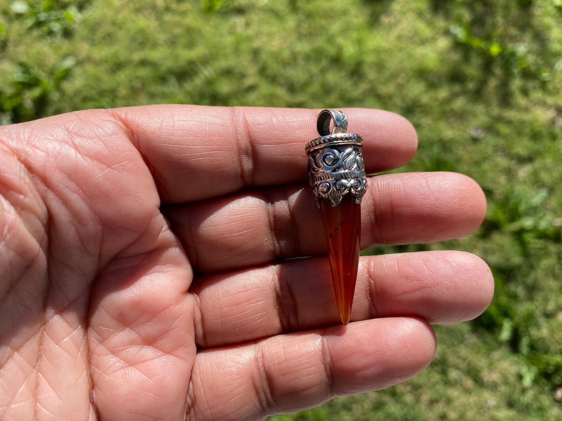 This beautiful pendant is hand-carved with a remarkable detail. This Tibetan designs pendant is hand carved in Nepal and adorned by a beautiful pendant which has a large hole bail that allows you to string it on thicker threads.Made with Tibetan Silver and Carnelian natural gemstones beautiful floral designs. These are sure to make an impact on your jewelry project. These Products would be a great addition to your necklace. These Pendant would look great strung on beaded Necklace. Chain or Mala.Beauty and magic of this pendant that is unmatched as they are handmade and are one of a kind. With the nature of them being handmade, each product is unique in its own right and no two products are the exact same. Measurement: approximately Length 48 mm (measuring from bail to bottom), width 13 mm from the widest side, bail size: 7 mm and weight about 8.20 gm.