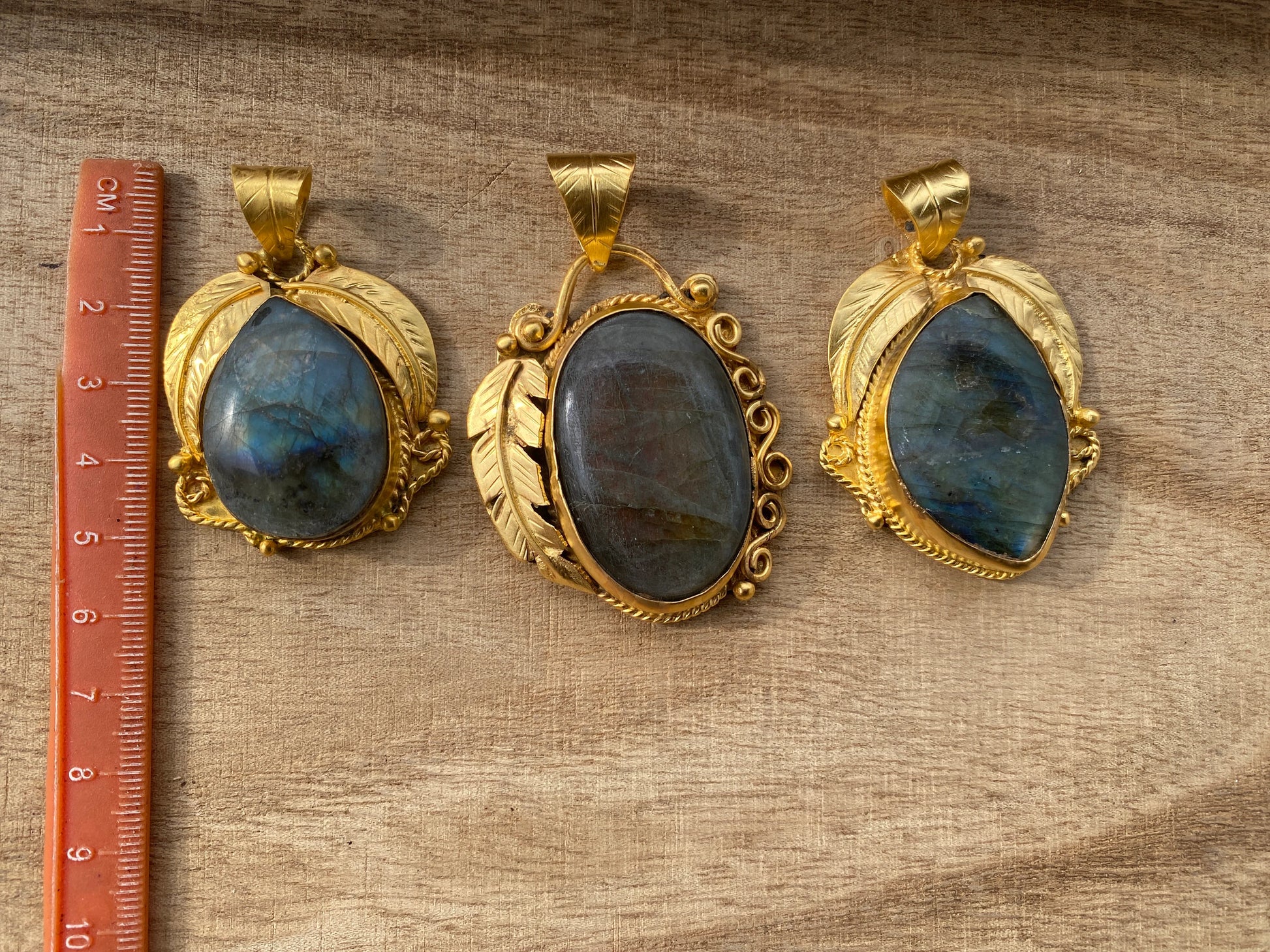 This one of a kind Large Tibetan Pendant made with 18K Matte Gold Overlay over Brass with Anti Tarnish Finish. Step into a world of enchantment with our Gold-Encased Labradorite Pendant. Handpicked for its mesmerizing play of colors, each labradorite stone dances with iridescent blues, greens, and golds, reminiscent of the ethereal Northern Lights. Encircled in a delicately crafted gold setting, this pendant not only offers the mysterious allure of labradorite but also the timeless elegance of gold. Worn close to the heart, it's more than just a piece of jewelry; it's a journey to nature's most captivating phenomena, captured and transformed into a keepsake of enduring beauty. Whether you're dressing up for a special occasion or simply adding a touch of magic to your everyday ensemble, this pendant promises to be a conversation starter.