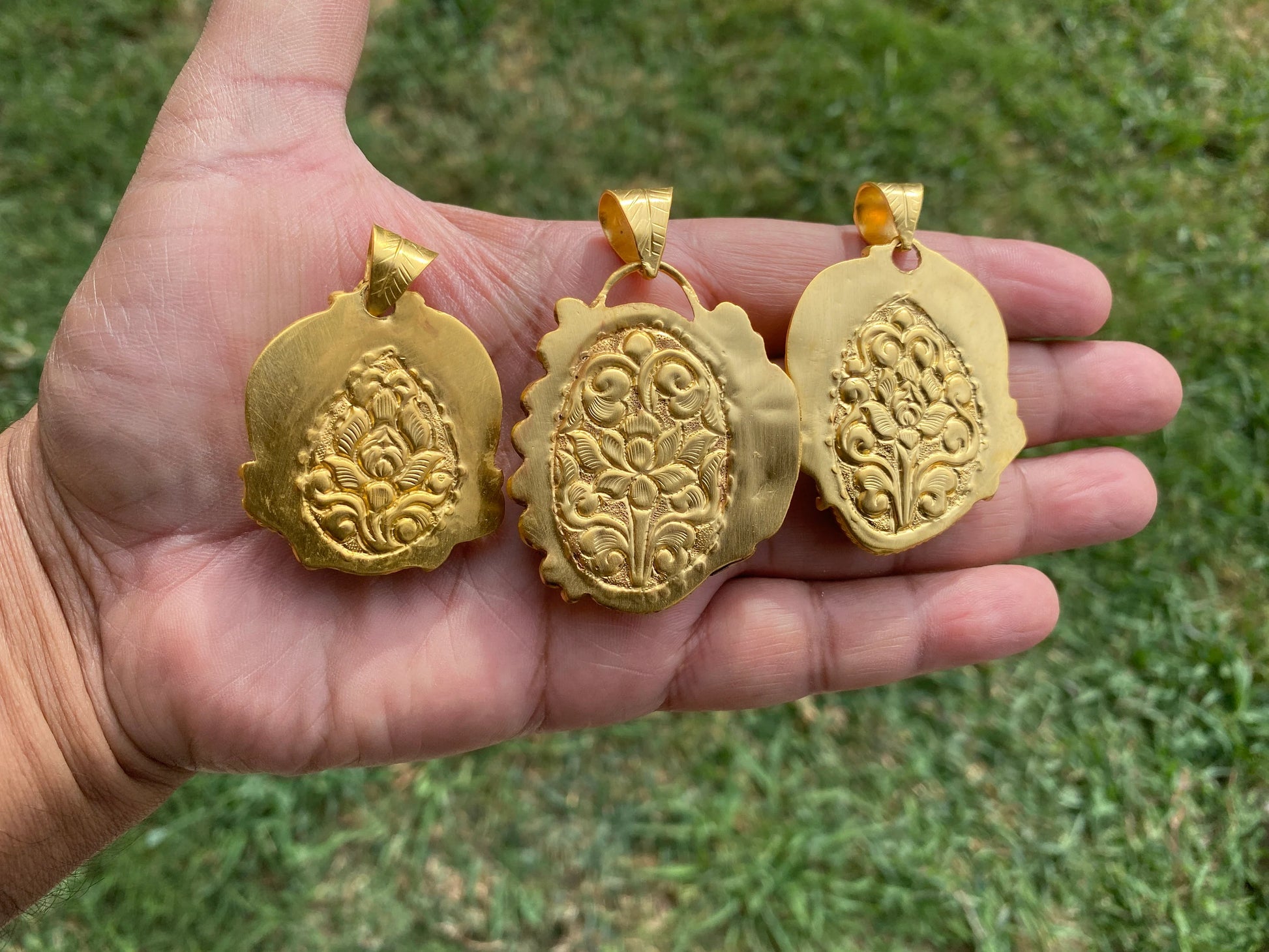 Measurement: Left Pendant: approximately Length 52 mm (measuring from bail to bottom), width 35 mm from the widest side, bail size: 9 mm and weight about 21.80 gm.Center Pendant: approximately Length 65 mm (measuring from bail to bottom), width 40 mm from the widest side, bail size: 9 mm and weight about 32.20 gm.Right Pendant: approximately Length 60 mm (measuring from bail to bottom), width 35 mm from the widest side, bail size: 9 mm and weight about 27.10 gm.