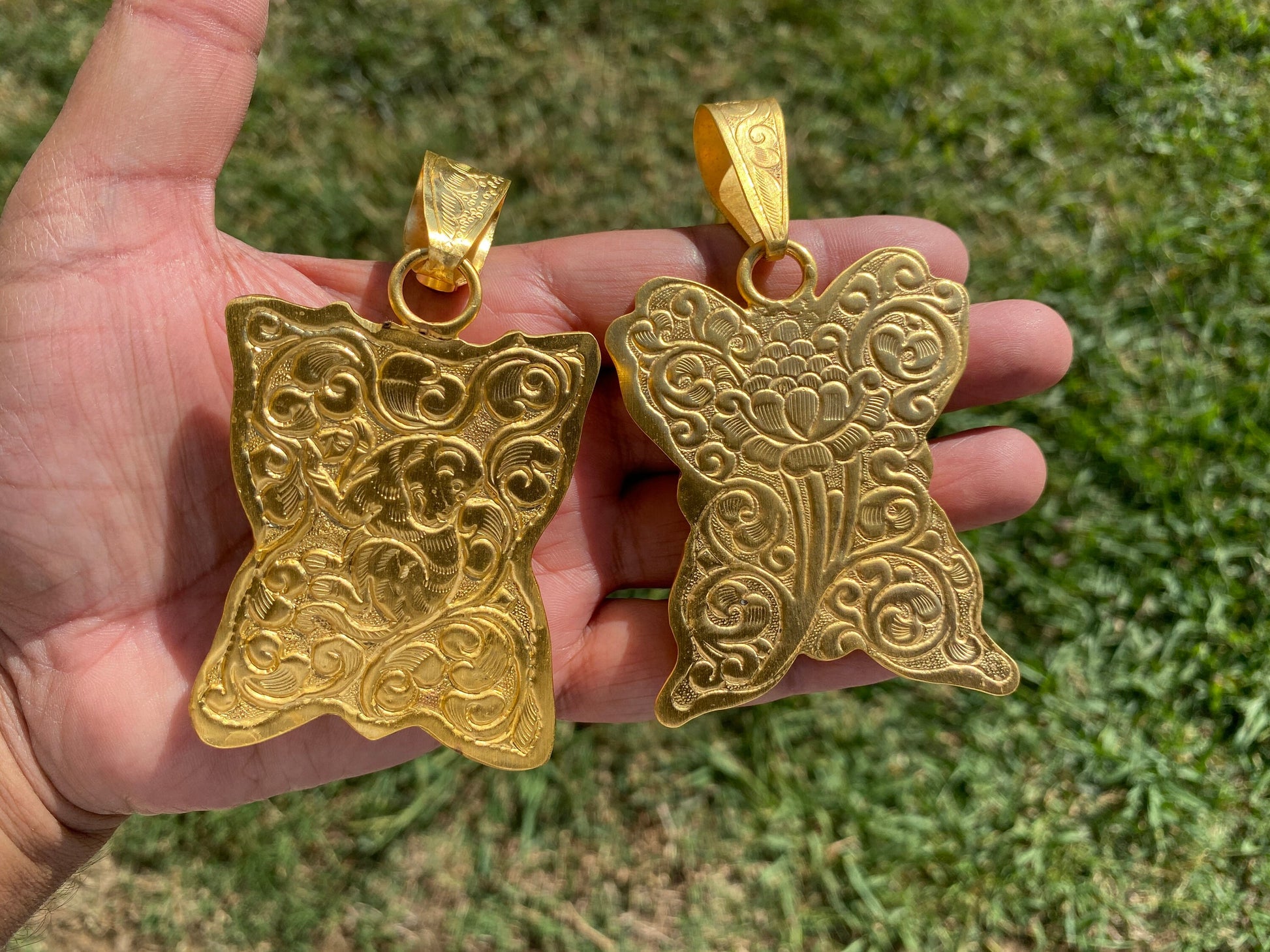This one of a kind Large Tibetan Pendant made with 18K Matte Gold Overlay over Brass with Anti Tarnish Finish. Step into a world of enchantment with our Gold-Encased Labradorite Pendant. Handpicked for its mesmerizing play of colors, each labradorite stone dances with iridescent blues, greens, and golds, reminiscent of the ethereal Northern Lights. Encircled in a delicately crafted gold setting, this pendant not only offers the mysterious allure of labradorite but also the timeless elegance of gold. Worn close to the heart, it's more than just a piece of jewelry; it's a journey to nature's most captivating phenomena, captured and transformed into a keepsake of enduring beauty. Whether you're dressing up for a special occasion or simply adding a touch of magic to your everyday ensemble, this pendant promises to be a conversation starter.✤ Keep in mind:1. Product VarianceAs the jewelry is handmade in nature, the items may experience variance in texture, shape, color, and finish. This also comes with some imperfections, which sets them apart from jewelry made in a factory – that being said please read the description thoroughly and view the pictures before you make your final purchase. As always, please don’t hesitate to ask us if you have any questions as we are more than happy to provide you with utmost quality assurance.