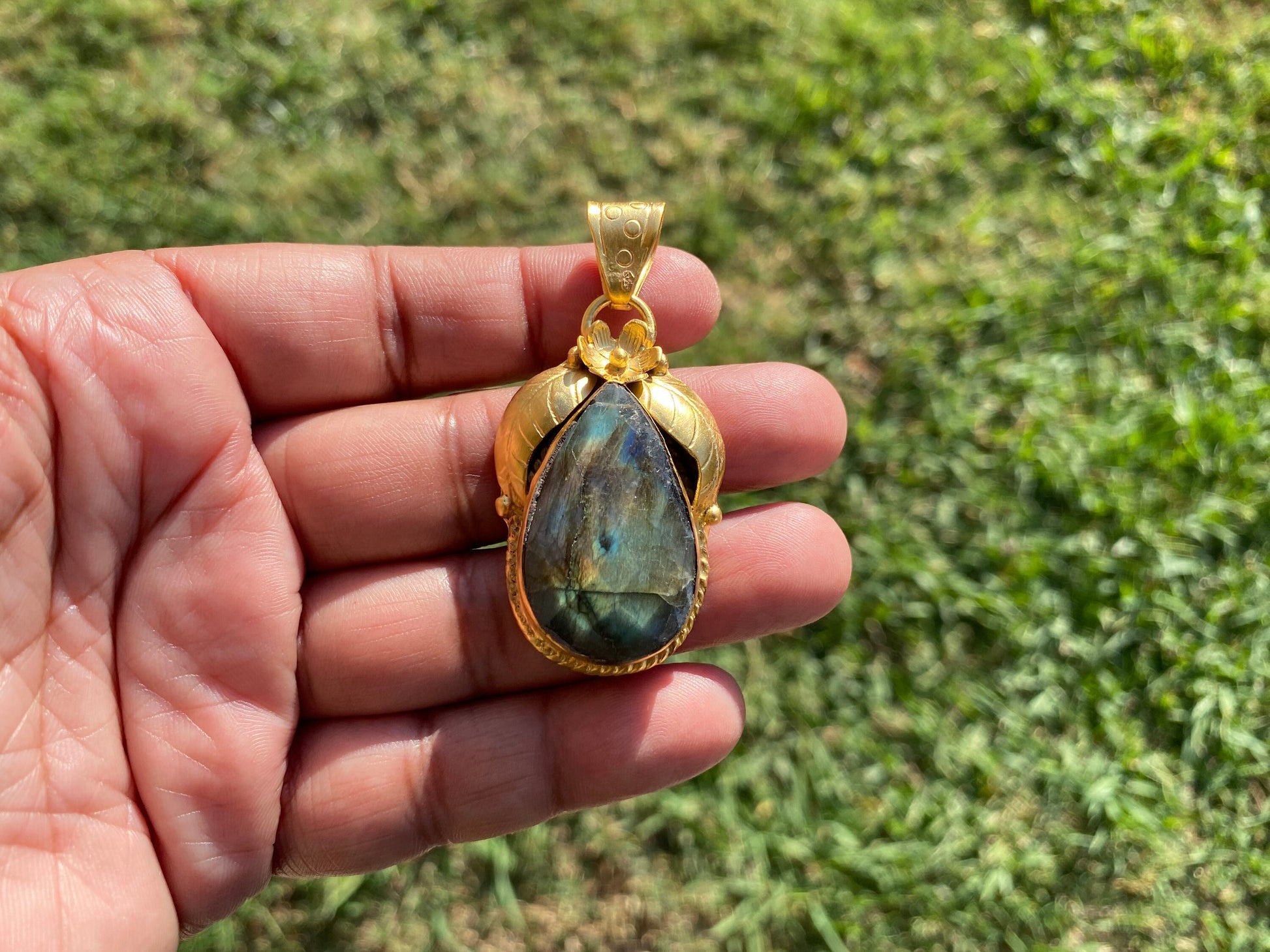 This one of a kind Large Tibetan Pendant made with 18K Matte Gold Overlay over Brass with Anti Tarnish Finish. Step into a world of enchantment with our Gold-Encased Labradorite Pendant. Handpicked for its mesmerizing play of colors, each labradorite stone dances with iridescent blues, greens, and golds, reminiscent of the ethereal Northern Lights. Encircled in a delicately crafted gold setting, this pendant not only offers the mysterious allure of labradorite but also the timeless elegance of gold. Worn close to the heart, it's more than just a piece of jewelry; it's a journey to nature's most captivating phenomena, captured and transformed into a keepsake of enduring beauty. Whether you're dressing up for a special occasion or simply adding a touch of magic to your everyday ensemble, this pendant promises to be a conversation starter.✤ Keep in mind:1. Product VarianceAs the jewelry is handmade in nature, the items may experience variance in texture, shape, color, and finish. This also comes with some imperfections, which sets them apart from jewelry made in a factory – that being said please read the description thoroughly and view the pictures before you make your final purchase. As always, please don’t hesitate to ask us if you have any questions as we are more than happy to provide you with utmost quality assurance.