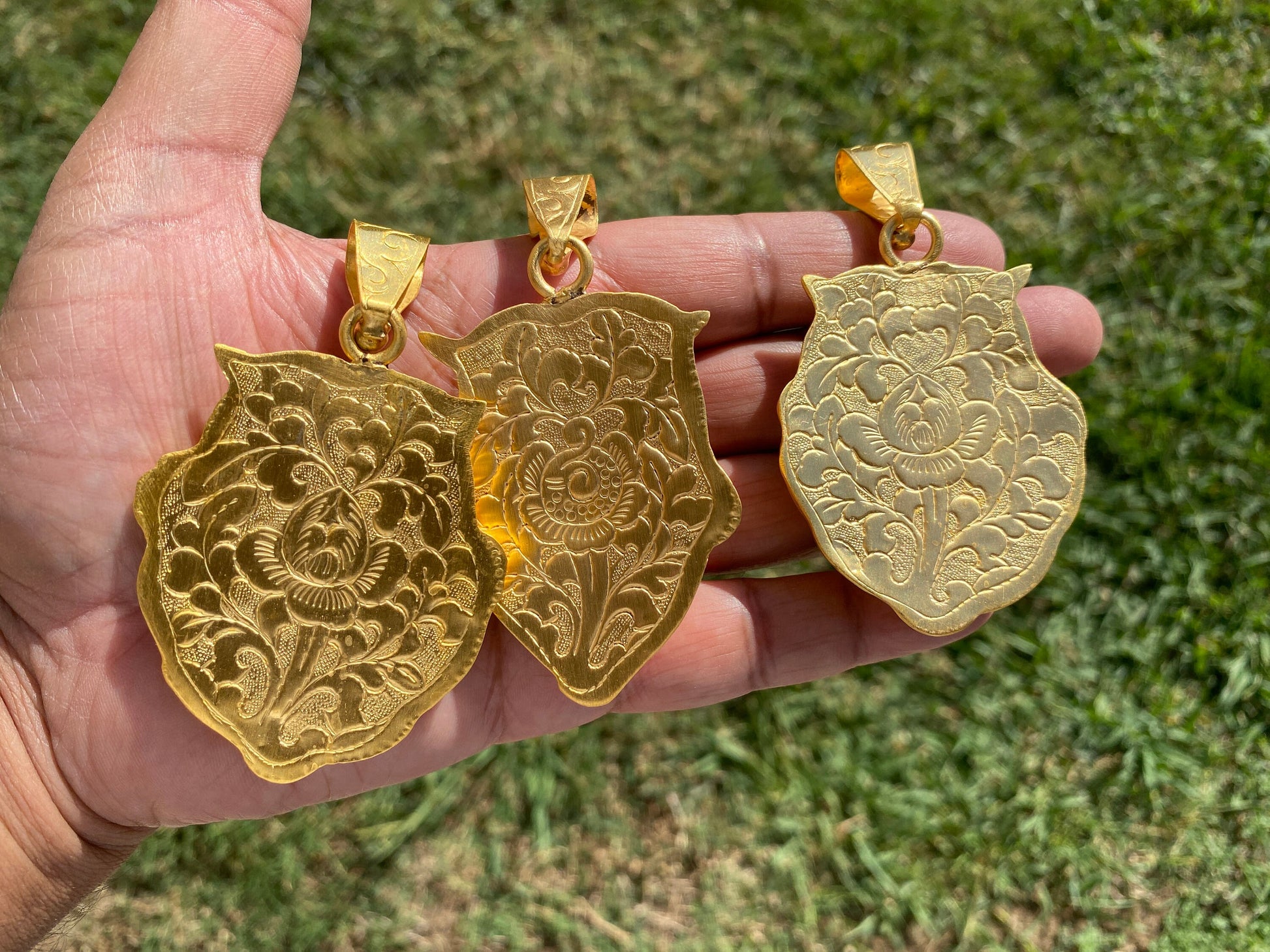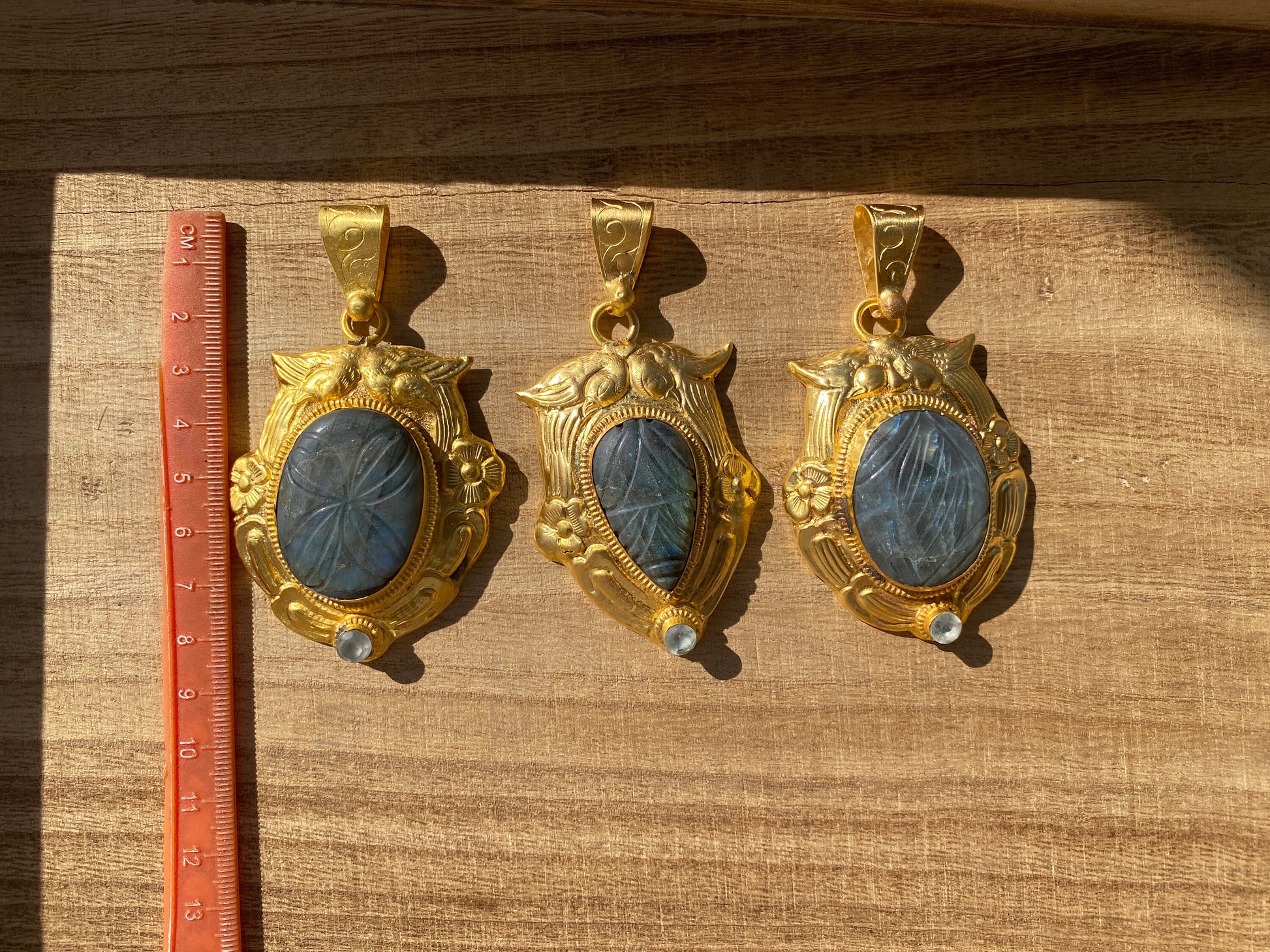 This one of a kind Large Tibetan Pendant made with 18K Matte Gold Overlay over Brass with Anti Tarnish Finish. Step into a world of enchantment with our Gold-Encased Labradorite Pendant. Handpicked for its mesmerizing play of colors, each labradorite stone dances with iridescent blues, greens, and golds, reminiscent of the ethereal Northern Lights. Encircled in a delicately crafted gold setting, this pendant not only offers the mysterious allure of labradorite but also the timeless elegance of gold. Worn close to the heart, it's more than just a piece of jewelry; it's a journey to nature's most captivating phenomena, captured and transformed into a keepsake of enduring beauty. Whether you're dressing up for a special occasion or simply adding a touch of magic to your everyday ensemble, this pendant promises to be a conversation starter.✤ Keep in mind:1. Product VarianceAs the jewelry is handmade in nature, the items may experience variance in texture, shape, color, and finish. This also comes with some imperfections, which sets them apart from jewelry made in a factory – that being said please read the description thoroughly and view the pictures before you make your final purchase. As always, please don’t hesitate to ask us if you have any questions as we are more than happy to provide you with utmost quality assurance.
