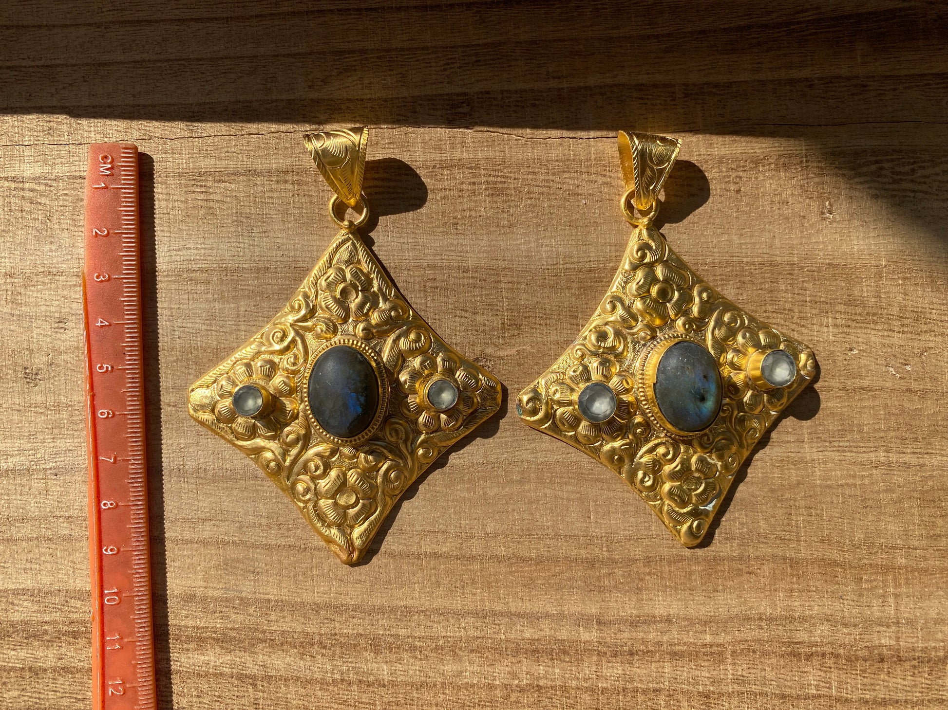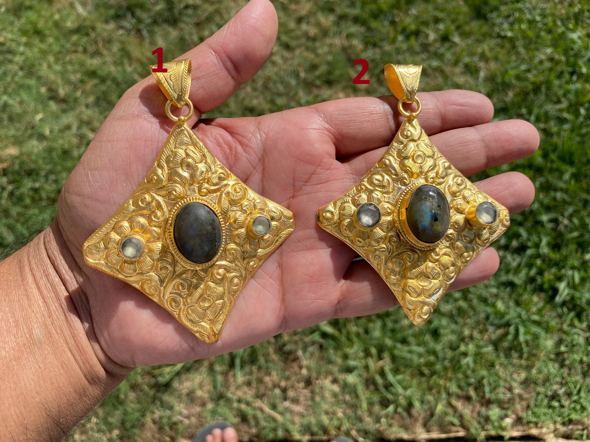 This one of a kind Large Tibetan Pendant made with 18K Matte Gold Overlay over Brass with Anti Tarnish Finish. Step into a world of enchantment with our Gold-Encased Labradorite Pendant. Handpicked for its mesmerizing play of colors, each labradorite stone dances with iridescent blues, greens, and golds, reminiscent of the ethereal Northern Lights. Encircled in a delicately crafted gold setting, this pendant not only offers the mysterious allure of labradorite but also the timeless elegance of gold. Worn close to the heart, it's more than just a piece of jewelry; it's a journey to nature's most captivating phenomena, captured and transformed into a keepsake of enduring beauty. Whether you're dressing up for a special occasion or simply adding a touch of magic to your everyday ensemble, this pendant promises to be a conversation starter.✤ Keep in mind:1. Product VarianceAs the jewelry is handmade in nature, the items may experience variance in texture, shape, color, and finish. This also comes with some imperfections, which sets them apart from jewelry made in a factory – that being said please read the description thoroughly and view the pictures before you make your final purchase. As always, please don’t hesitate to ask us if you have any questions as we are more than happy to provide you with utmost quality assurance.