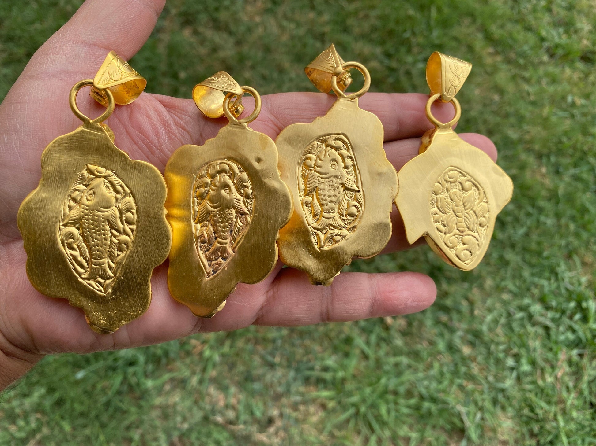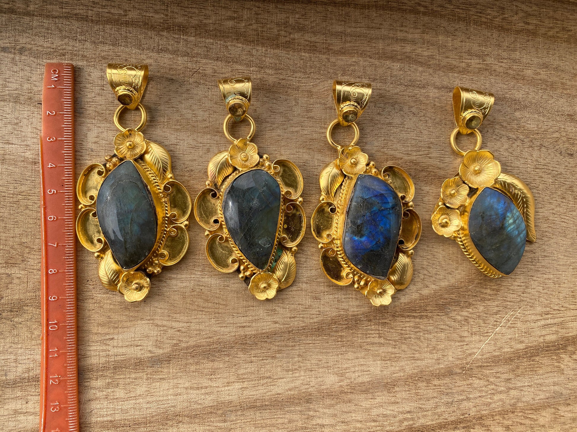 This one of a kind Large Tibetan Pendant made with 18K Matte Gold Overlay over Brass with Anti Tarnish Finish. Step into a world of enchantment with our Gold-Encased Labradorite Pendant. Handpicked for its mesmerizing play of colors, each labradorite stone dances with iridescent blues, greens, and golds, reminiscent of the ethereal Northern Lights. Encircled in a delicately crafted gold setting, this pendant not only offers the mysterious allure of labradorite but also the timeless elegance of gold. Worn close to the heart, it's more than just a piece of jewelry; it's a journey to nature's most captivating phenomena, captured and transformed into a keepsake of enduring beauty. Whether you're dressing up for a special occasion or simply adding a touch of magic to your everyday ensemble, this pendant promises to be a conversation starter.✤ Keep in mind:1. Product VarianceAs the jewelry is handmade in nature, the items may experience variance in texture, shape, color, and finish. This also comes with some imperfections, which sets them apart from jewelry made in a factory – that being said please read the description thoroughly and view the pictures before you make your final purchase. As always, please don’t hesitate to ask us if you have any questions as we are more than happy to provide you with utmost quality assurance. 2. Photography & ColorsDue to the fact that we photograph each of our items, some items may seem larger than the actual size and the colors may seem off as well, please make sure to read the dimensions in order to avoid problems that can be easily taken care of. We do our best to photograph the items with as much detail as possible, however, images can deceive the eye, again – feel free to reach us with any questions or concerns!3. LiabilityDiscover Designs Inc. shall not be held responsible for any injuries, damages, or losses resulting from the use of products purchased from our shop. Therefore, by purchasing from our Etsy Store, you the costumer agree that all purchases and uses of products are responsibilities of the buyer. With that said, Discover Designs will not be held responsible for the use, misuse, or mishandling of any items and buyers assume all liabilities for the products they have purchased. The purchase of an item from Discover Designs demonstrates acceptance of this disclosure and releases Discover Designs and its affiliates from liabilities arising thereof. ✪Not a toy, not intended for use by, or in products intended for children. Thanks for stopping by!