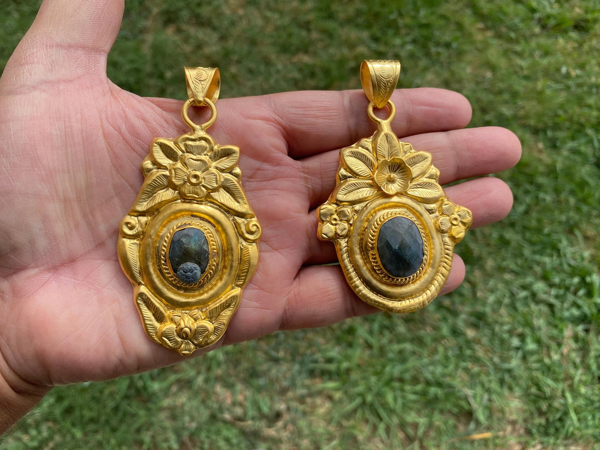 This one of a kind Large Tibetan Pendant made with 18K Matte Gold Overlay over Brass with Anti Tarnish Finish. Step into a world of enchantment with our Gold-Encased Labradorite Pendant. Handpicked for its mesmerizing play of colors, each labradorite stone dances with iridescent blues, greens, and golds, reminiscent of the ethereal Northern Lights. Encircled in a delicately crafted gold setting, this pendant not only offers the mysterious allure of labradorite but also the timeless elegance of gold. Worn close to the heart, it's more than just a piece of jewelry; it's a journey to nature's most captivating phenomena, captured and transformed into a keepsake of enduring beauty. Whether you're dressing up for a special occasion or simply adding a touch of magic to your everyday ensemble, this pendant promises to be a conversation starter.✤ Keep in mind:1. Product VarianceAs the jewelry is handmade in nature, the items may experience variance in texture, shape, color, and finish. This also comes with some imperfections, which sets them apart from jewelry made in a factory – that being said please read the description thoroughly and view the pictures before you make your final purchase. As always, please don’t hesitate to ask us if you have any questions as we are more than happy to provide you with utmost quality assurance.