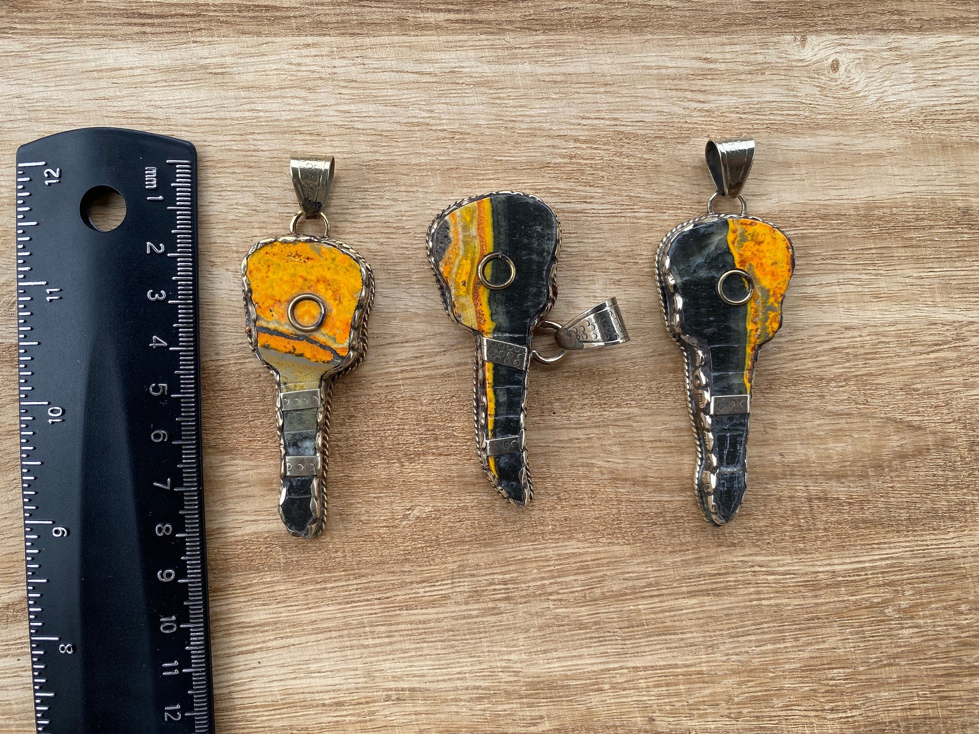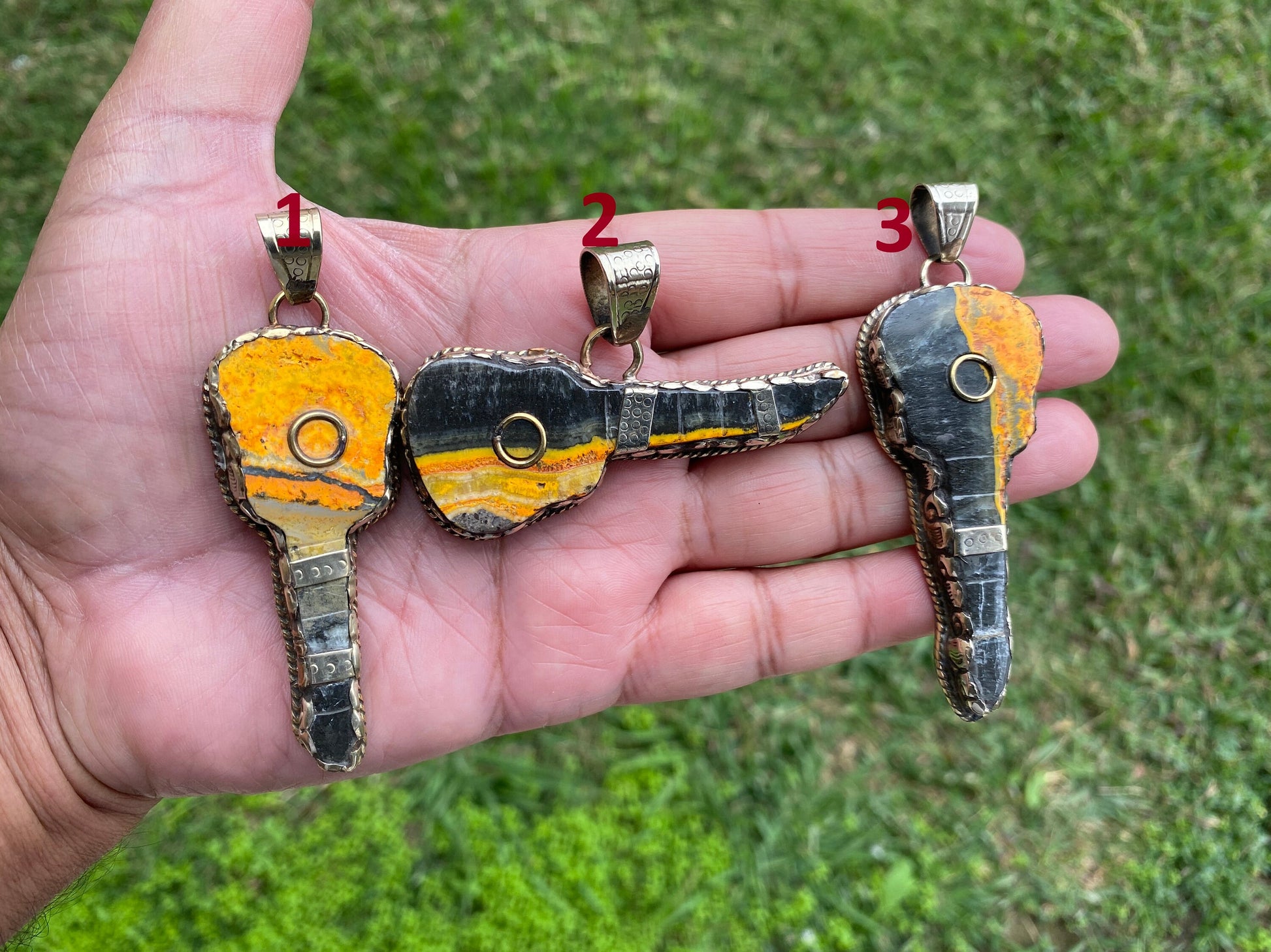 Beautiful handcrafted Bumble bee Jasper Guitar Pendant made with Tibetan Silver. These pendants are sure to make an impact on your jewelry project. These pendant would be a great addition to your necklace project and would looks great strung on beaded necklace , chain or Malas.