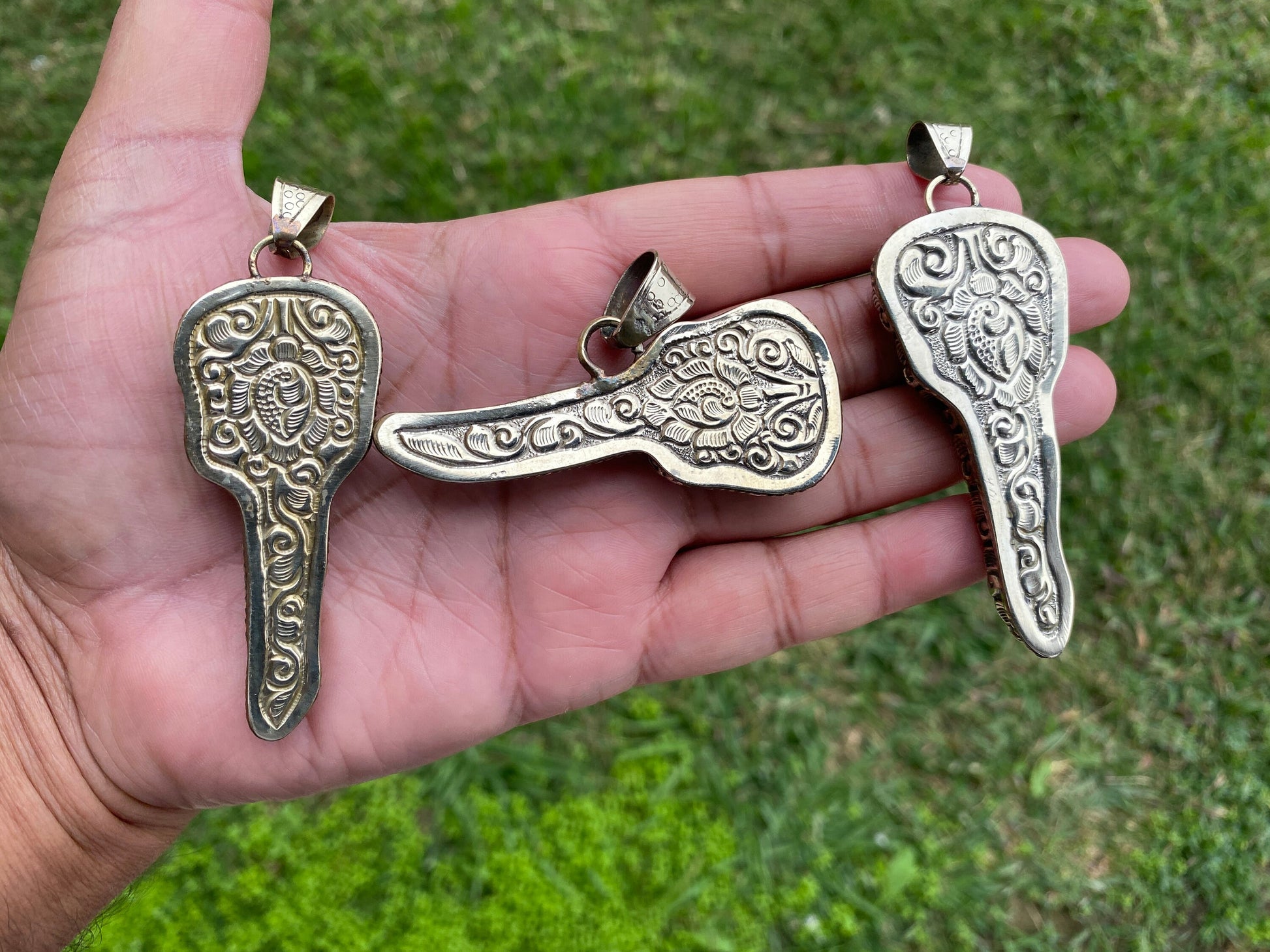 The pendant has a beautiful carving design in the back and the large hanging hole of 10 mm allows you to add thicker threads and leather. These Nepali pendants have a beauty and magic to them that is unmatched as they are handmade in Kathmandu, Nepal and are one of a kind. With the nature of them being handmade, each product is unique in its own right and no two products are the same.