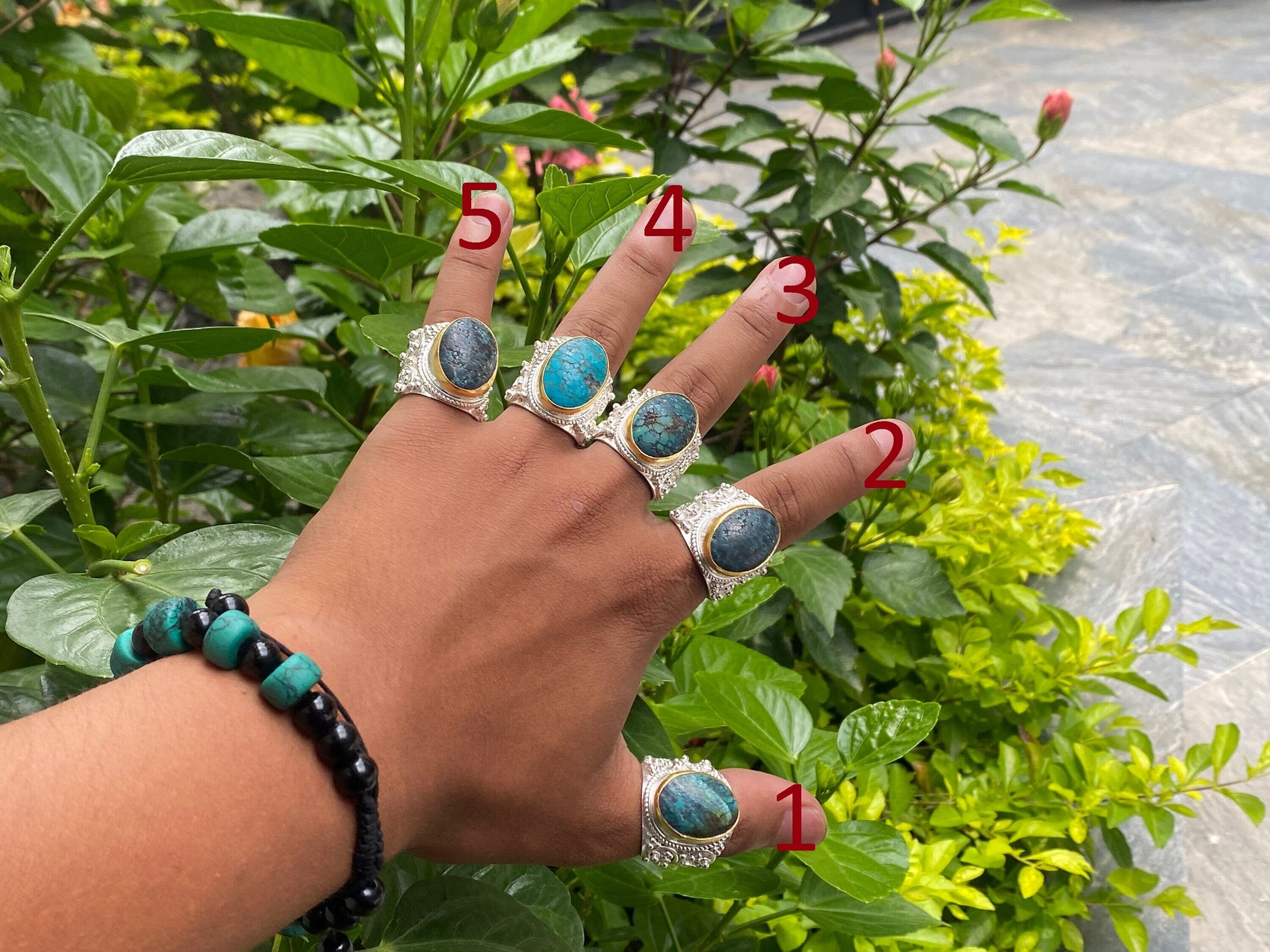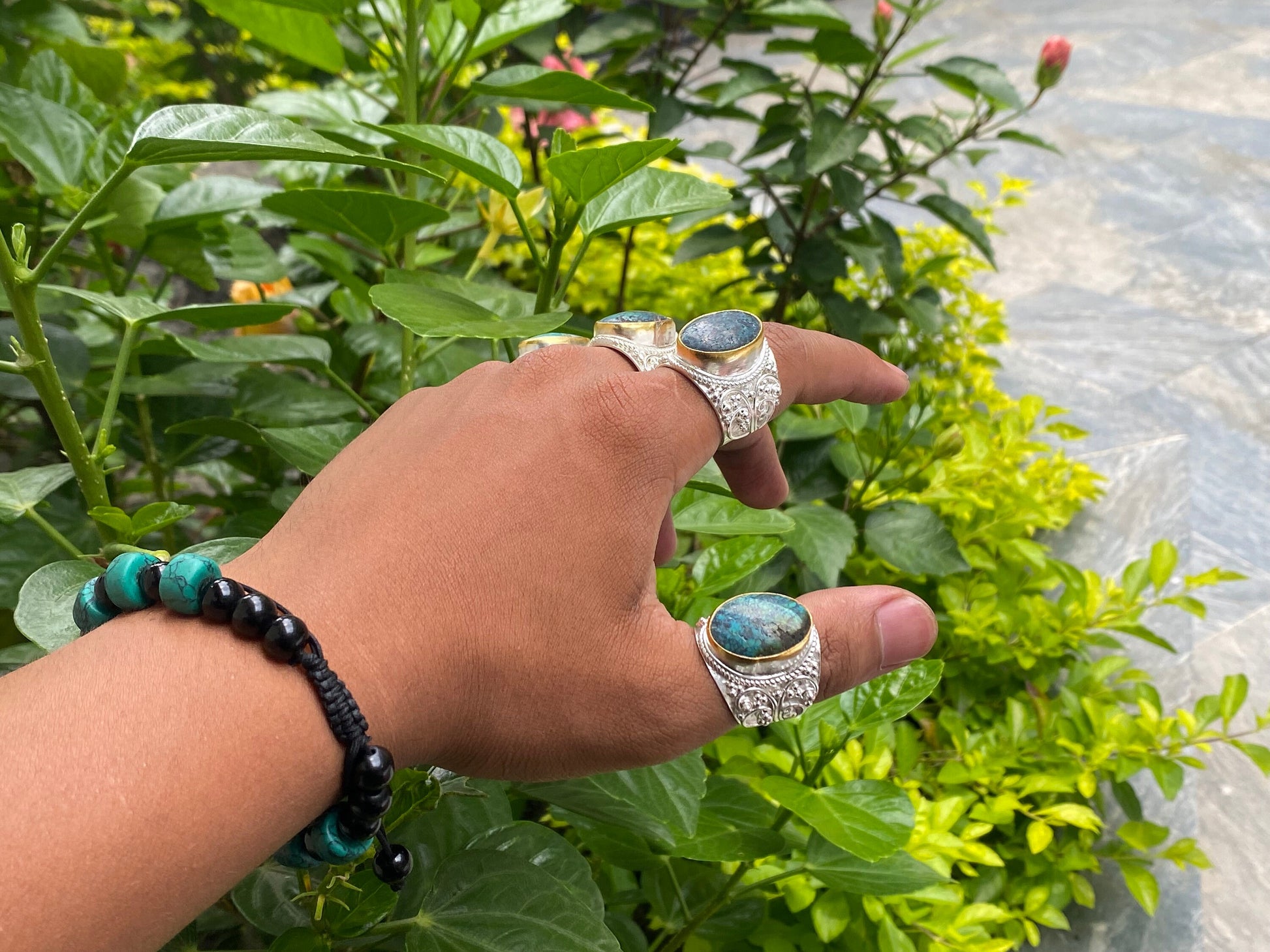 A natural turquoise gemstone set in hammered brass with brushed gold and silver overlays adorns this handcrafted ring from Nepal. Its strikingly simple design, which combines hippy and bohemian aesthetics, makes it a perfect present. This one-of-a-kind design, which is ideal for both men and women, blends artisan craftsmanship with the healing qualities frequently linked to natural gemstones like turquoise.