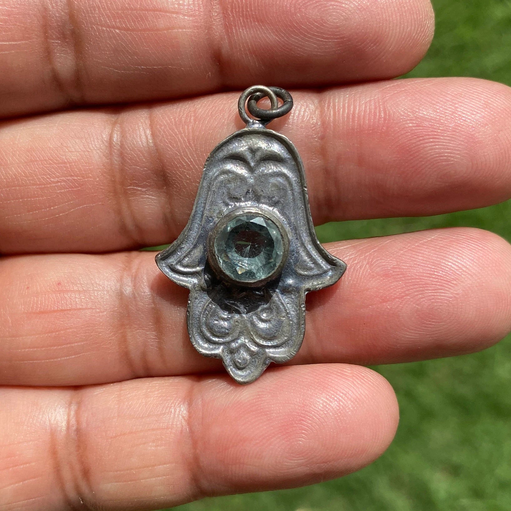 This listing is for 1 piece.At wholesale price!!!Made with Oxidize Brass & Faceted Green Topaz, Heat Treated Ruby or Citrine gemstone small pendant or charm. These are sure to make an impact on your jewelry project. This pendant would be a great addition to your necklace, would look great strung on beaded Necklace or Bracelet, Chain, Mala or you can make beautiful earring also.The Hand of Fatima ( Hamsa ) is an ancient Middle Eastern amulet symbolizing the Hand of God. In all faiths it is a protective sign. It brings its owner happiness, luck, health, and good fortune. Measurement: approximately Length 40 mm (measuring from bail to bottom), width 24 mm from the widest side, bail size: 5 mm and weighs about 6 gm.