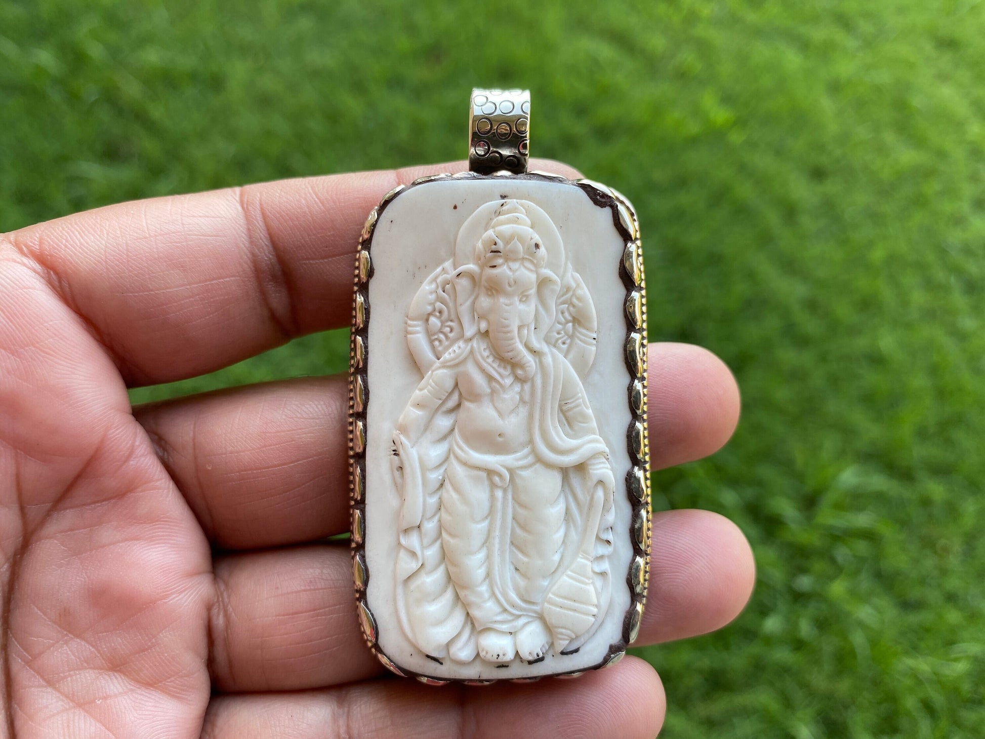 This Gorgeous pendant is hand-carved with a remarkable details of Ganesha. Hand-carved animal design on the back side of Pendant. This Tibetan designs pendant is handmade in Nepal and adorned by a beautiful pendant. Perfectly yoga in style, these tribal beauties come from the Himalayas. Beauty of this pendant that is unmatched as they are handmade and are one of a kind. With the nature of them being handmade, each product is unique in its own right and no two products are the exact same.