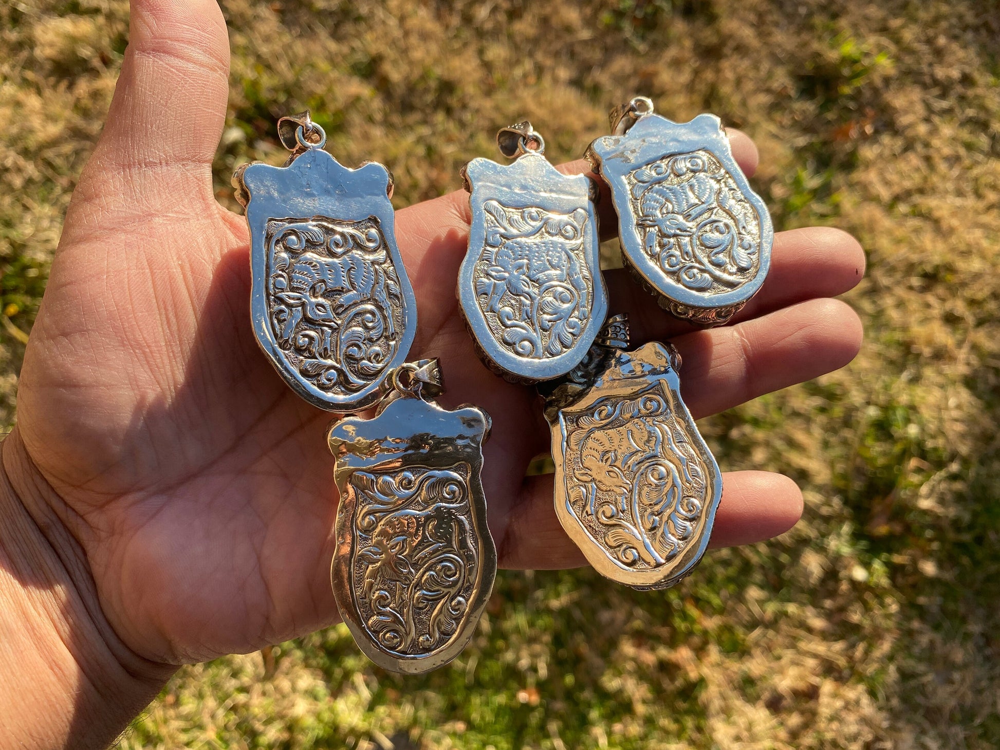 Made with Tibetan Silver with Natural Carved Labradorite stone. Beautiful hand carved animal on the back. These are sure to make an impact on your jewelry project. This pendant would be a great addition to your necklace, would look great strung on beaded Necklace, Chain or Mala.Beauty and magic of this pendant that is unmatched as they are handmade and are one of a kind. With the nature of them being handmade, each product is unique in its own right and no two products are the exact same. Large BailMeasurement: approximately Length 68 mm (measuring from bail to bottom), width 32 mm from the widest side, bail size: 8 mm and weighs about 36.00 gm.DA: 0420Disclaimer: Items are handmade so please note: Each item is unique may have some small imperfections. There can be a slight difference in actual color than shown in picture.Images may appear enlarged or smaller. Please refer to the measurements given. ✤ Keep in mind:1. Product VarianceAs the jewelry is handmade in nature, the items may experience variance in texture, shape, color, and finish. This also comes with some imperfections, which sets them apart from jewelry made in a factory – that being said please read the description thoroughly and view the pictures before you make your final purchase. As always, please don’t hesitate to ask us if you have any questions as we are more than happy to provide you with utmost quality assurance.