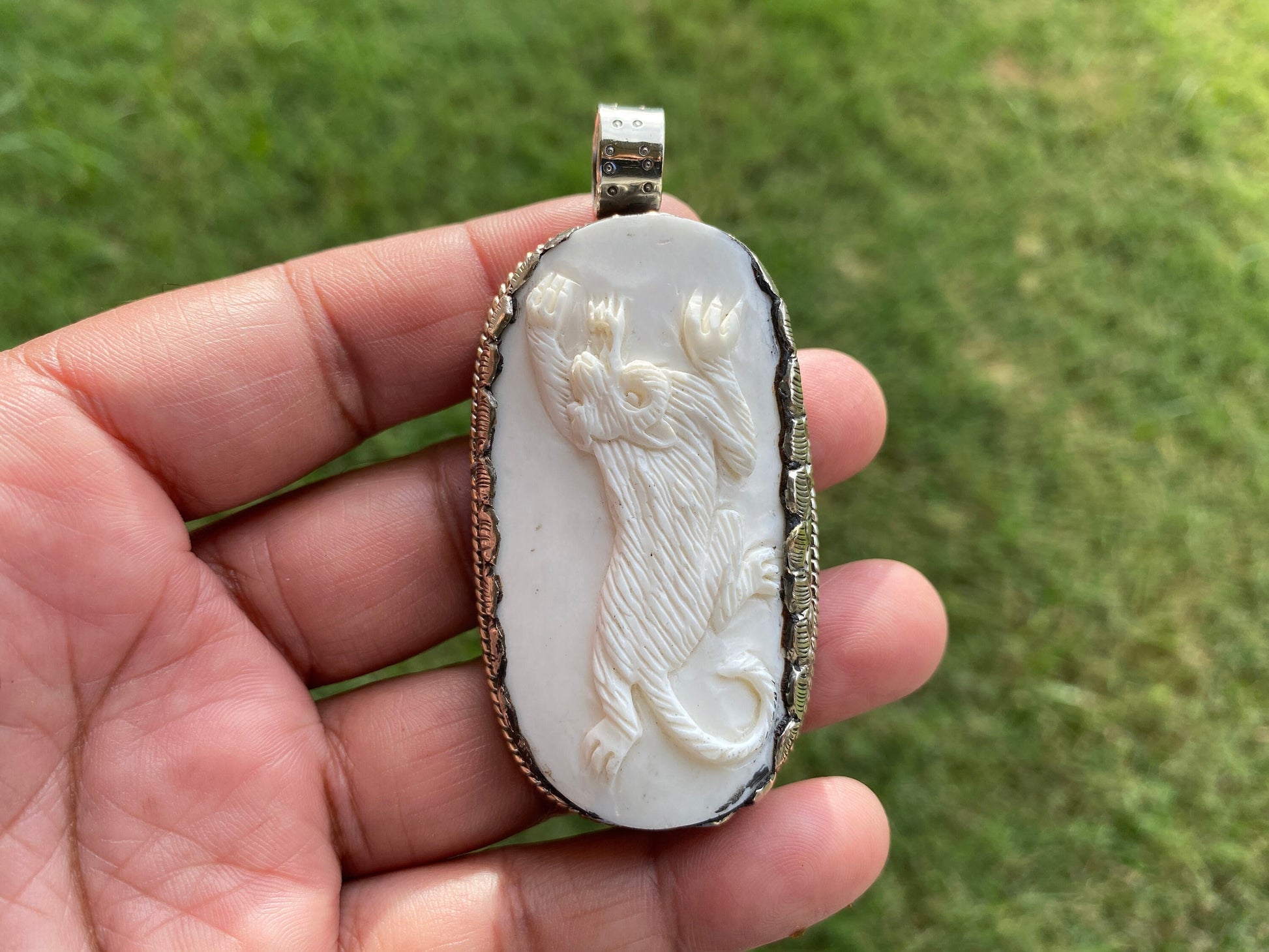 Hand Carved Tiger Tibetan Silver Bone Pendant, Wil d Animal, Perfect gift for Husband, Wild Live Jewelry, Viking Jewelry for Men and Women