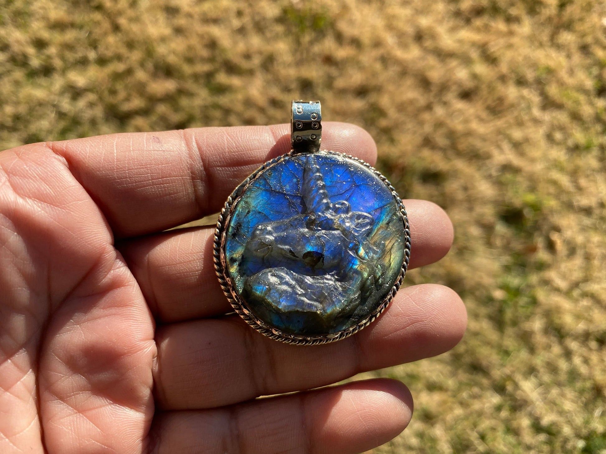 Hand Carved Unicorn Labradorite Tibetan Silver Pendant, Horse Pendant, Labradorite Unicorn, Healing Crystal, Animal Pendant, Animal Jewelry