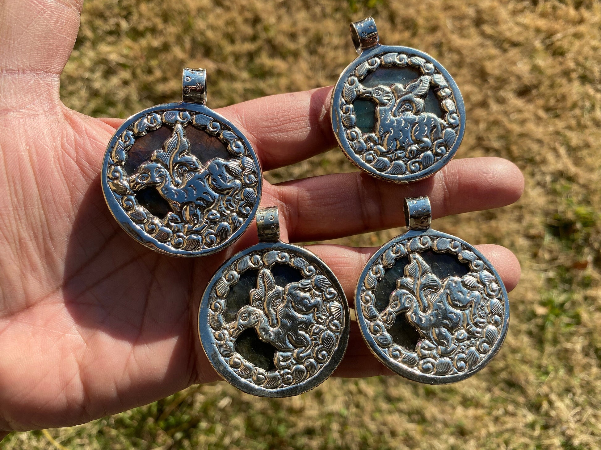 Made with Tibetan Silver with Natural Carved Labradorite stone. Beautiful hand carved on the back. These are sure to make an impact on your jewelry project. This pendant would be a great addition to your necklace, would look great strung on beaded Necklace, Chain or Mala.Beauty and magic of this pendant that is unmatched as they are handmade and are one of a kind. With the nature of them being handmade, each product is unique in its own right and no two products are the exact same. Large BailMeasurement: approximately Length 53 mm (measuring from bail to bottom), width 40 mm from the widest side, bail size: 10 mm and weighs about 32.50 gm.DD: 0350Disclaimer: Items are handmade so please note: Each item is unique may have some small imperfections. There can be a slight difference in actual color than shown in picture.Images may appear enlarged or smaller. Please refer to the measurements given. ✤ Keep in mind:1. Product VarianceAs the jewelry is handmade in nature, the items may experience variance in texture, shape, color, and finish. This also comes with some imperfections, which sets them apart from jewelry made in a factory – that being said please read the description thoroughly and view the pictures before you make your final purchase. As always, please don’t hesitate to ask us if you have any questions as we are more than happy to provide you with utmost quality assurance.