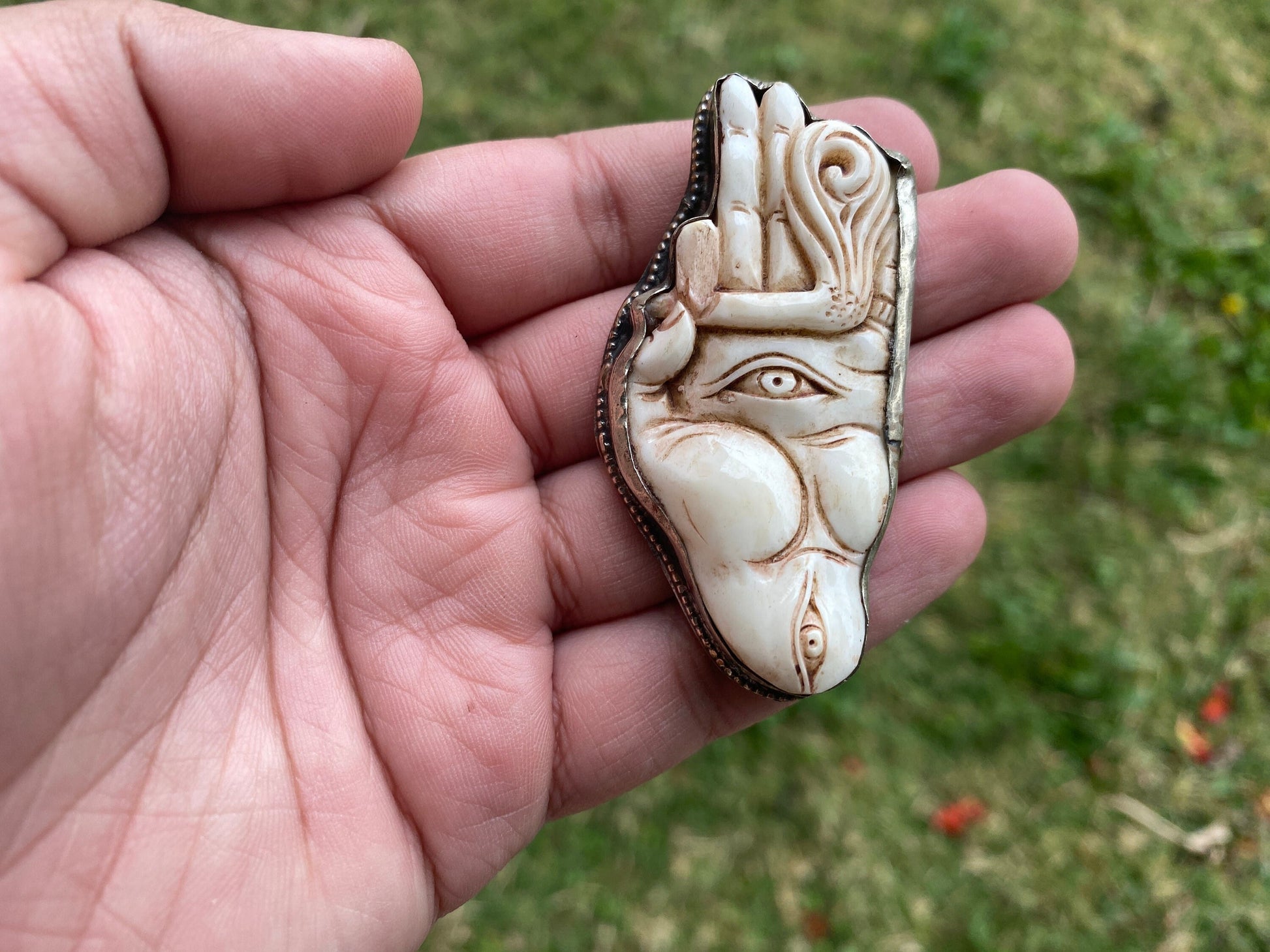 This Gorgeous Hand with Joint Bone Carved Tibetan Silver Pendant with a remarkable detail of carving with bird design on the back side of the Pendant. This Tibetan designs pendant is handmade in Nepal and adorned by a beautiful pendant. Perfectly bohemian in style, these tribal beauties come from the Himalayas. Beauty of this pendant that is unmatched as they are handmade and are one of a kind. With the nature of them being handmade, each product is unique in its own right and no two products are the exact same.