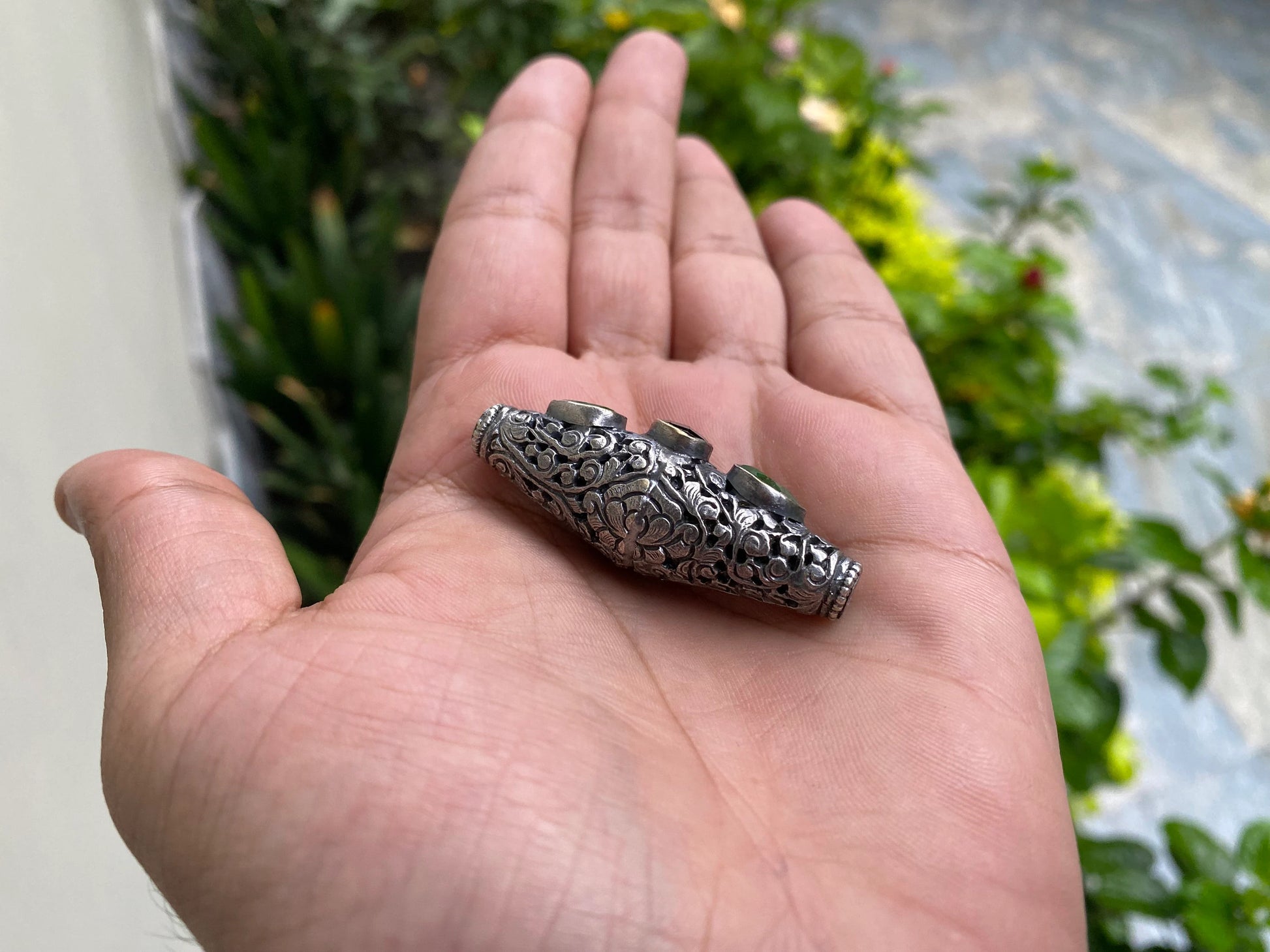 Handcrafted in Nepal, these Tibetan beads are made of copper, with intricate carvings and inlaid with black onyx and emerald. Very special additions for any necklace or bracelet projects. These artisan beads will make a striking impact strung on beaded necklaces or chains. Perfect for any kind of jewelry design.