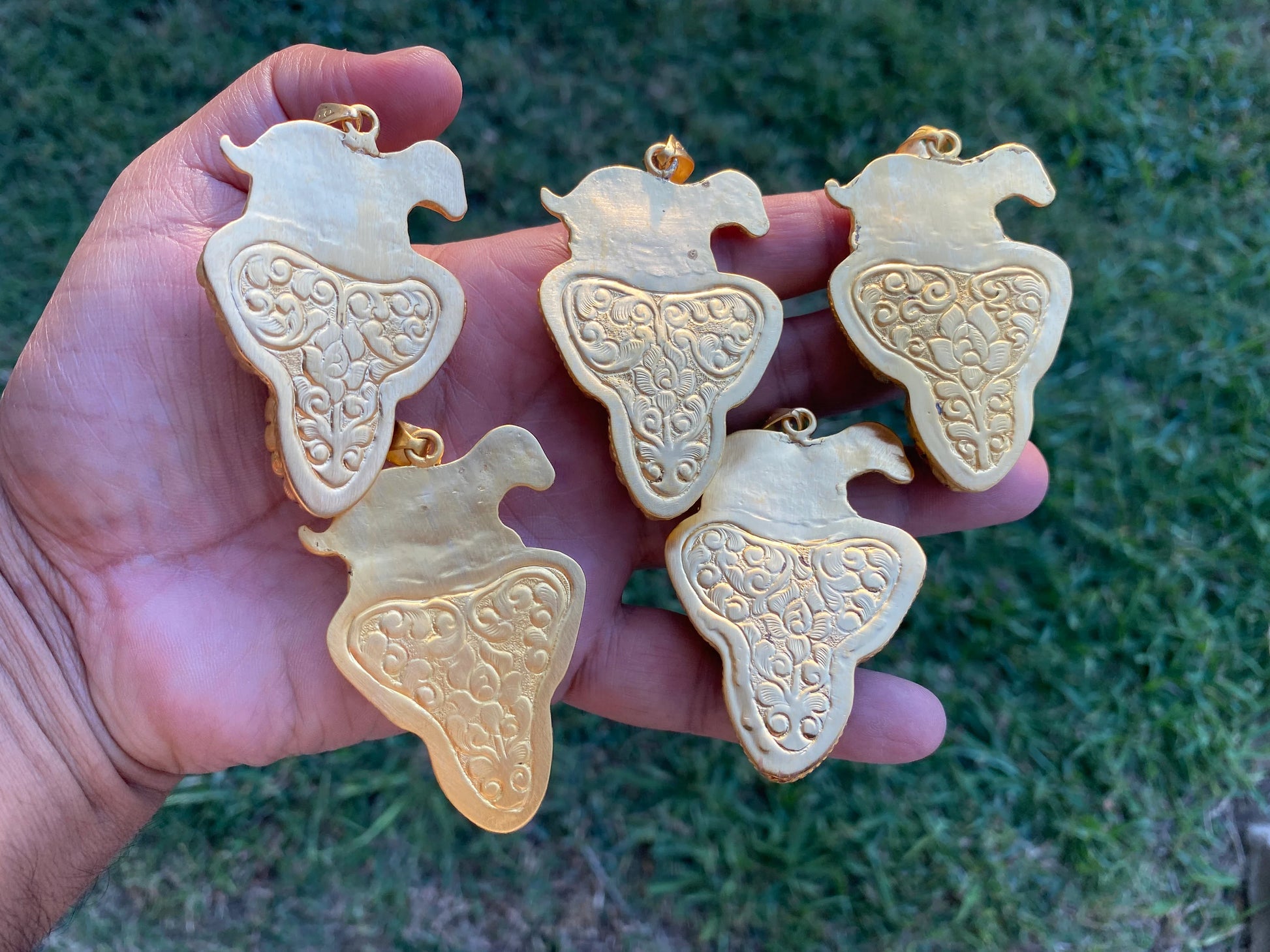 The Hand Carved Elephant Head Labradorite Gold Overlay over brass Pendant is more than just a piece of jewelry. It is a harmonious blend of art, nature, and spirituality; a pendant that speaks of elegance, reverence, and the timeless connection between man and nature. Wearing it is akin to carrying a fragment of the universe, intertwined with the wisdom of the elephant, close to one's heart.