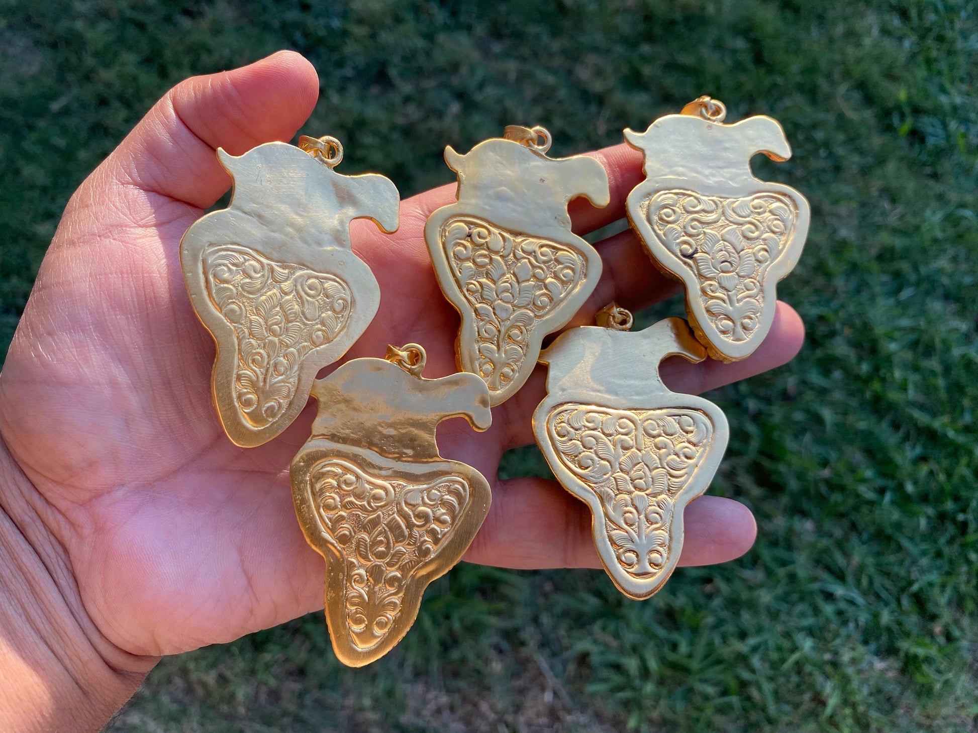The Hand Carved Elephant Head Labradorite Gold Overlay over brass Pendant is more than just a piece of jewelry. It is a harmonious blend of art, nature, and spirituality; a pendant that speaks of elegance, reverence, and the timeless connection between man and nature. Wearing it is akin to carrying a fragment of the universe, intertwined with the wisdom of the elephant, close to one's heart.