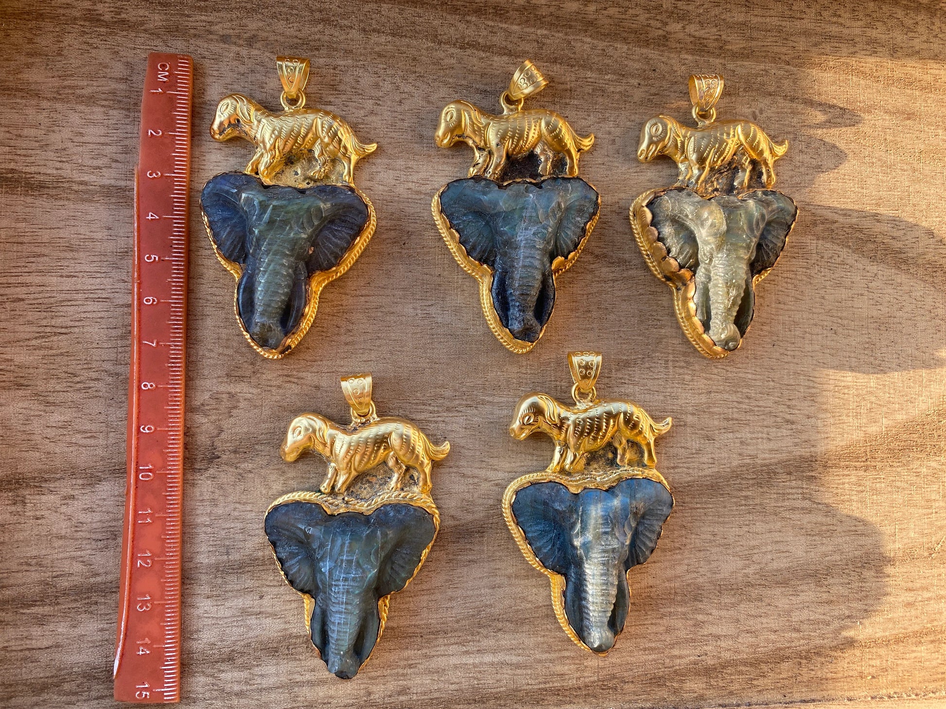 Handcrafted Elephant Head Labradorite Pendant, Non Tarnish Brushed Gold Overlay, Elephant Pendant, Animal Pendant, Unique Carving Jewelry