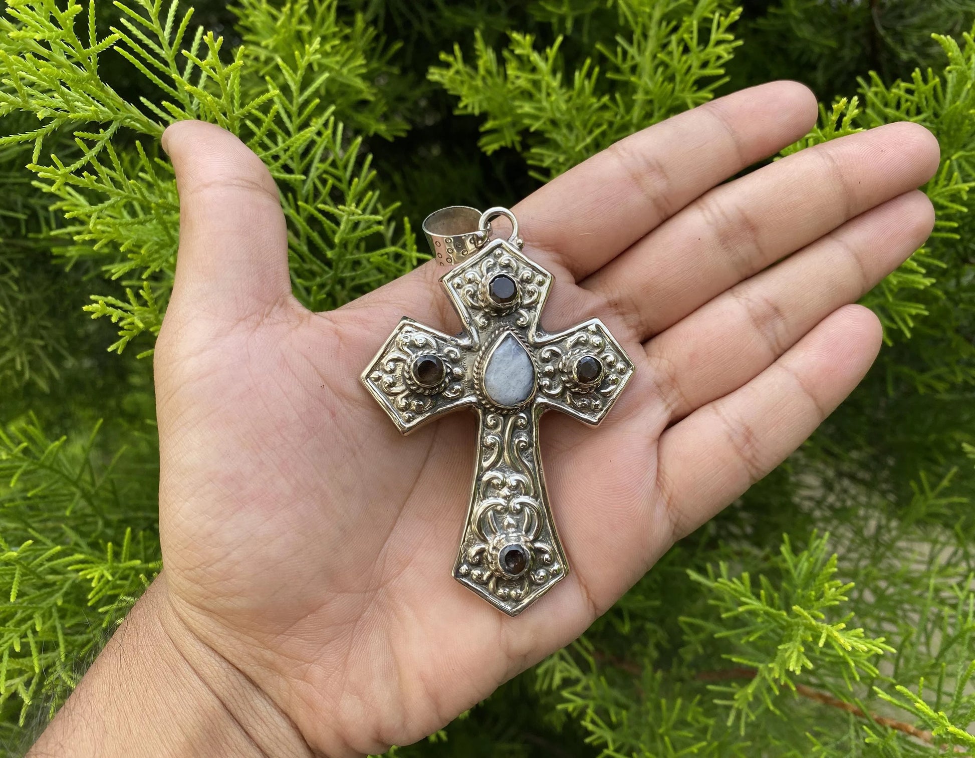 Handcrafted Tibetan Silver Cross Pendant with Moonstone and Smoky Quartz Gemstones | Christian Religious, Catholic Jewelry, Christ Inspired
