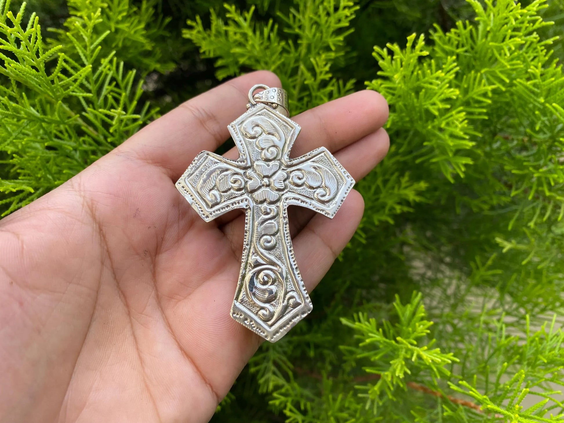 This handmade cross pendant is made from Tibetan Silver, featuring Moonstone and Smoky Quartz gemstones, with a hammered finish for added texture. Made in the Himalayas of Nepal, it's ideal for everyday wear or that special occasion. The spiritual design blends both elegance and meaning, making it an ideal choice for both religious occasions and everyday style.
