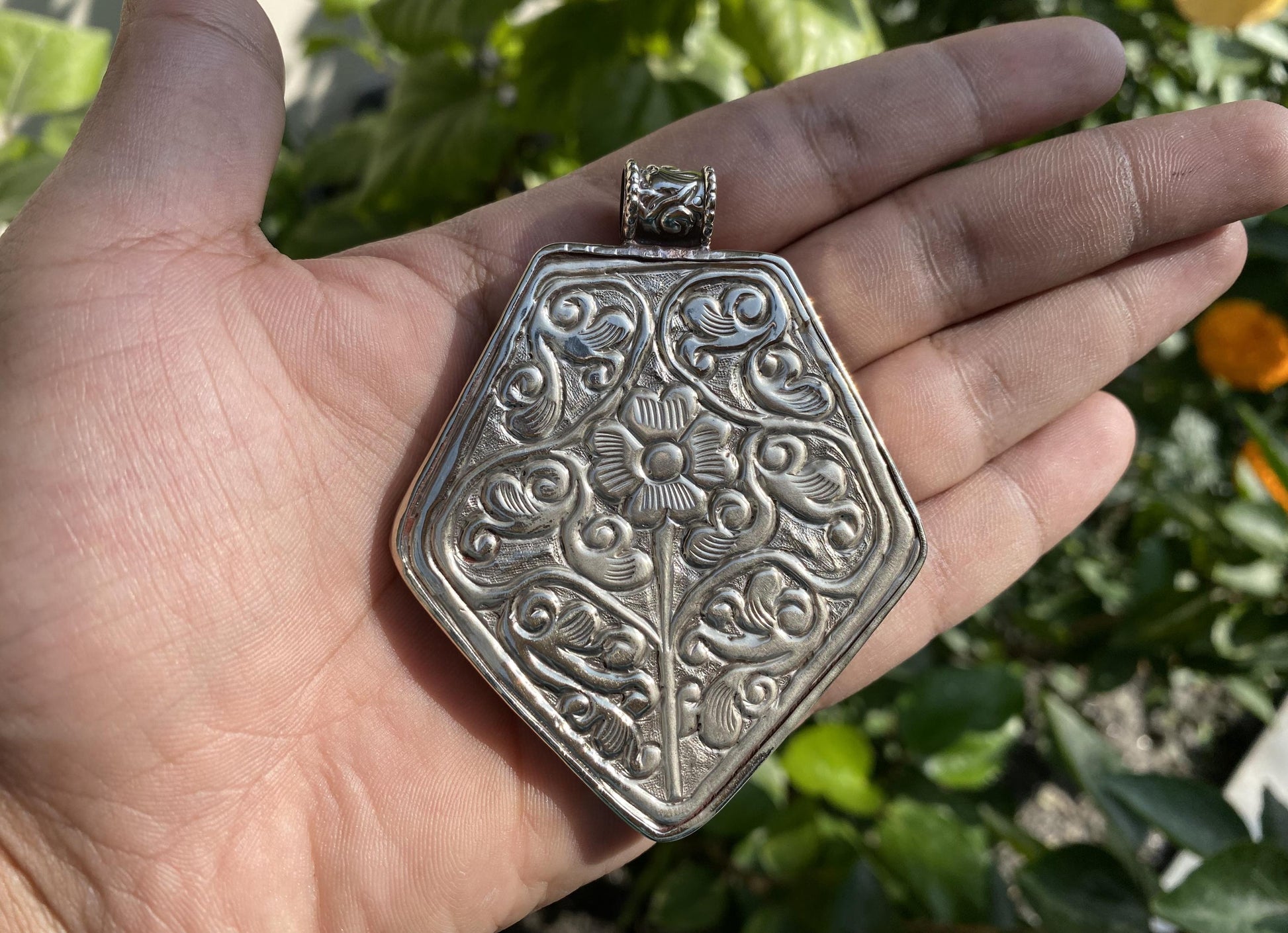 Handcrafted Tibetan Silver Hexagonal Pendant with Carved Rabbit and Floral Design | Unique Healing Amulet for Daily Wear, Bohemian Jewelry