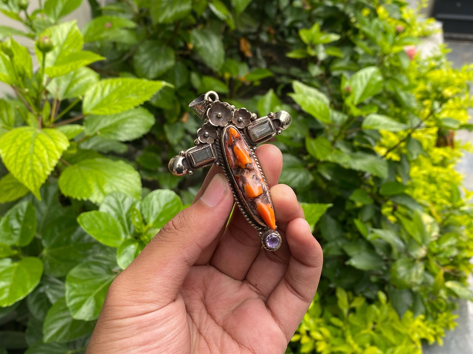 An eye-catching spiky orange oyster is nestled inside a Tibetan silver cross in this handcrafted bohemian pendant. Made to last and be worn every day, it's a distinctive unisex item that blends bohemian style with rustic charm. Because of its unique design and exquisite craftsmanship, the pendant is a versatile item that can be used to elevate any ensemble.