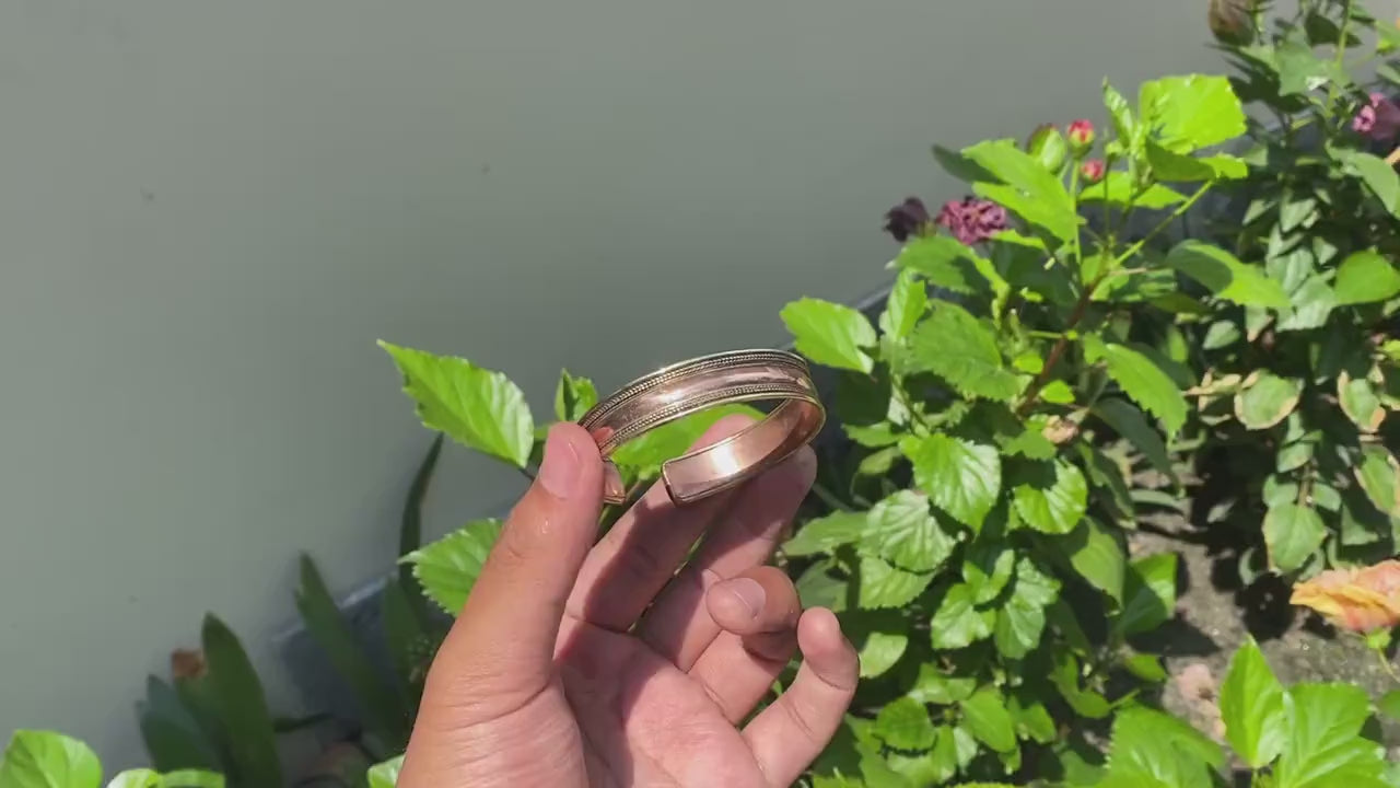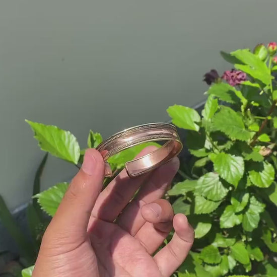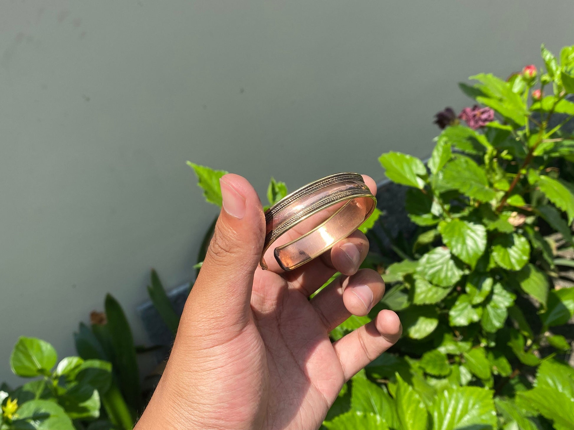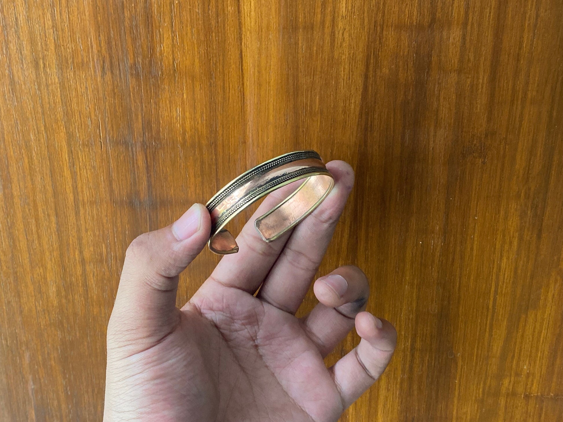 This handmade copper bracelet, accented with brass wire on the edges, boasts an antique design. Crafted in Nepal, it is perfect for daily wear and offers healing properties. Suitable for both men and women, this unique piece makes an excellent gift, blending traditional craftsmanship with modern elegance. Embrace style and wellness with this distinctive bracelet.