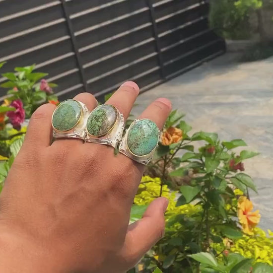 Individually handcrafted with care, this hammered turquoise ring embodies artisanal charm and timeless appeal. It is made in Nepal by Skillful artisans and Its adjustable design ensures a comfortable fit for any finger, while the fusion of gold and silver overlay adds a touch of elegance. Versatile and unisex, this two-tone piece radiates aesthetic allure, making it a must-have accessory for those seeking both style and substance.