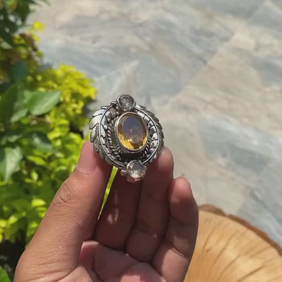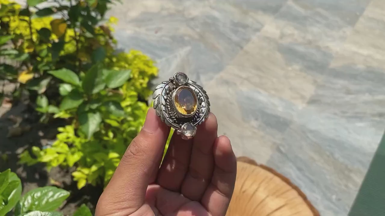 Enjoy a touch of elegance with this Handmade Tibetan Silver Ring set with White Topaz and Citrine. This timeless, sophisticated, unisex antique item is ideal for any setting. Its exquisite workmanship and brilliant jewels make it the ideal present, combining timeless style with visual appeal. This gorgeous ring will elevate your accessory game. It is a wonderful work of artisanal design art.