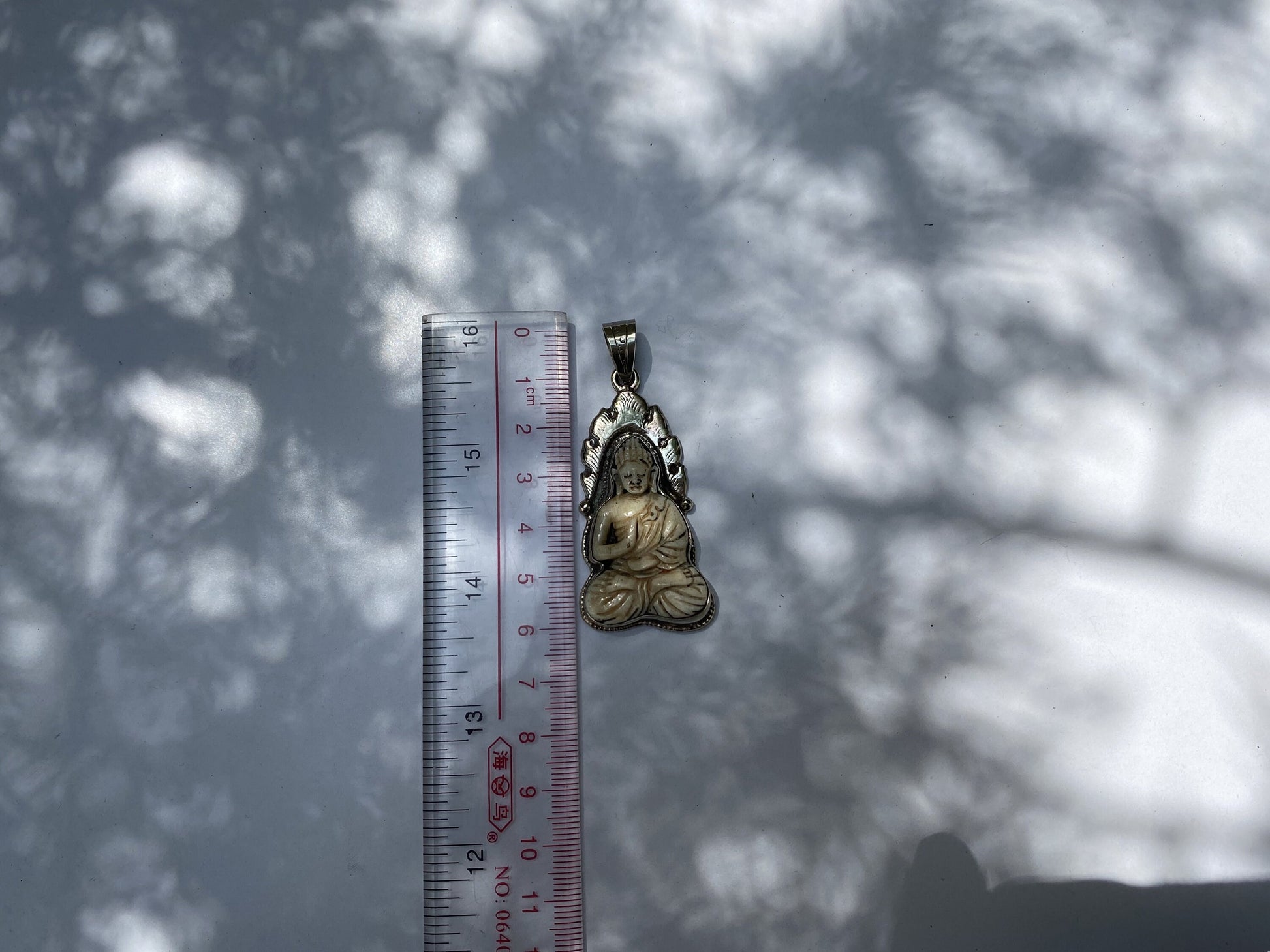 Harmony and Heritage: Buddha on Buffalo Bone with Tibetan Silver Surround, Buddha Carved Buffalo Bone Pendant in Tibetan Silver.