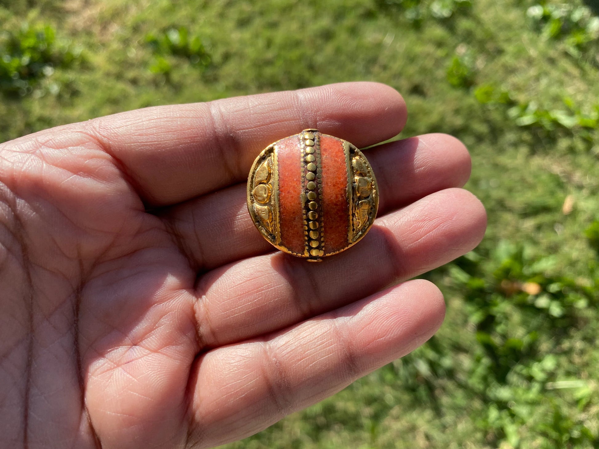 Himalayan Gold Beads, 18k Non Tarnish Brushed Gold Overlay Over Brass Bead, Turquoise with Coral Inlaid, Handmade Guru Bead for Necklace