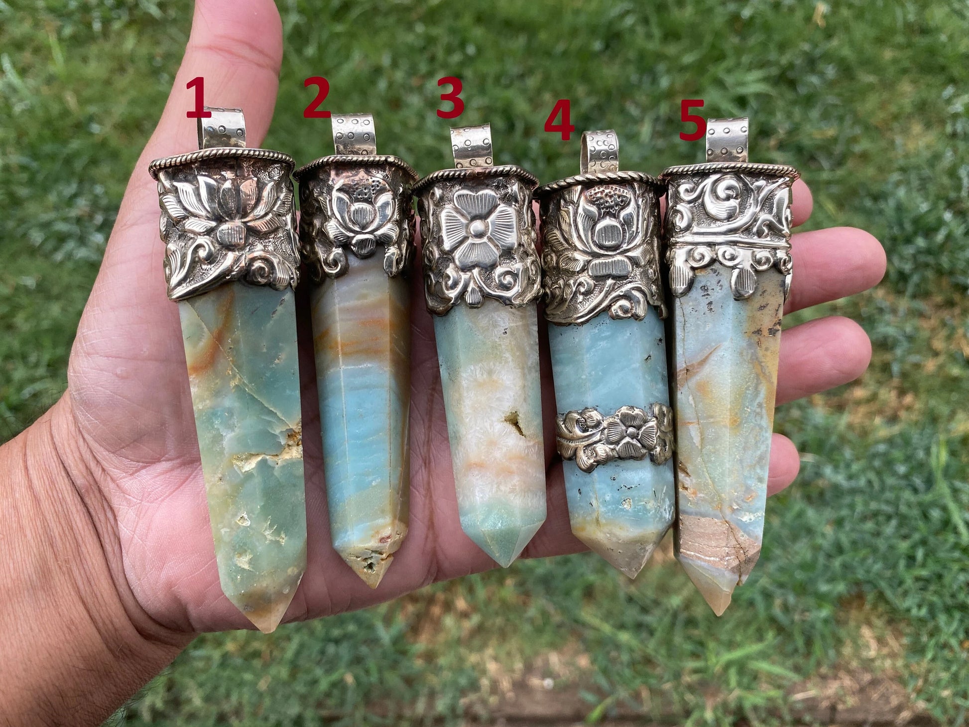 Huge Pointed Amazonite Crystal Tibetan Silver Pendant, Unique Design, Healing Point Crystal, Obelisk Crystal, Balancing Gem, Unique Jewelry