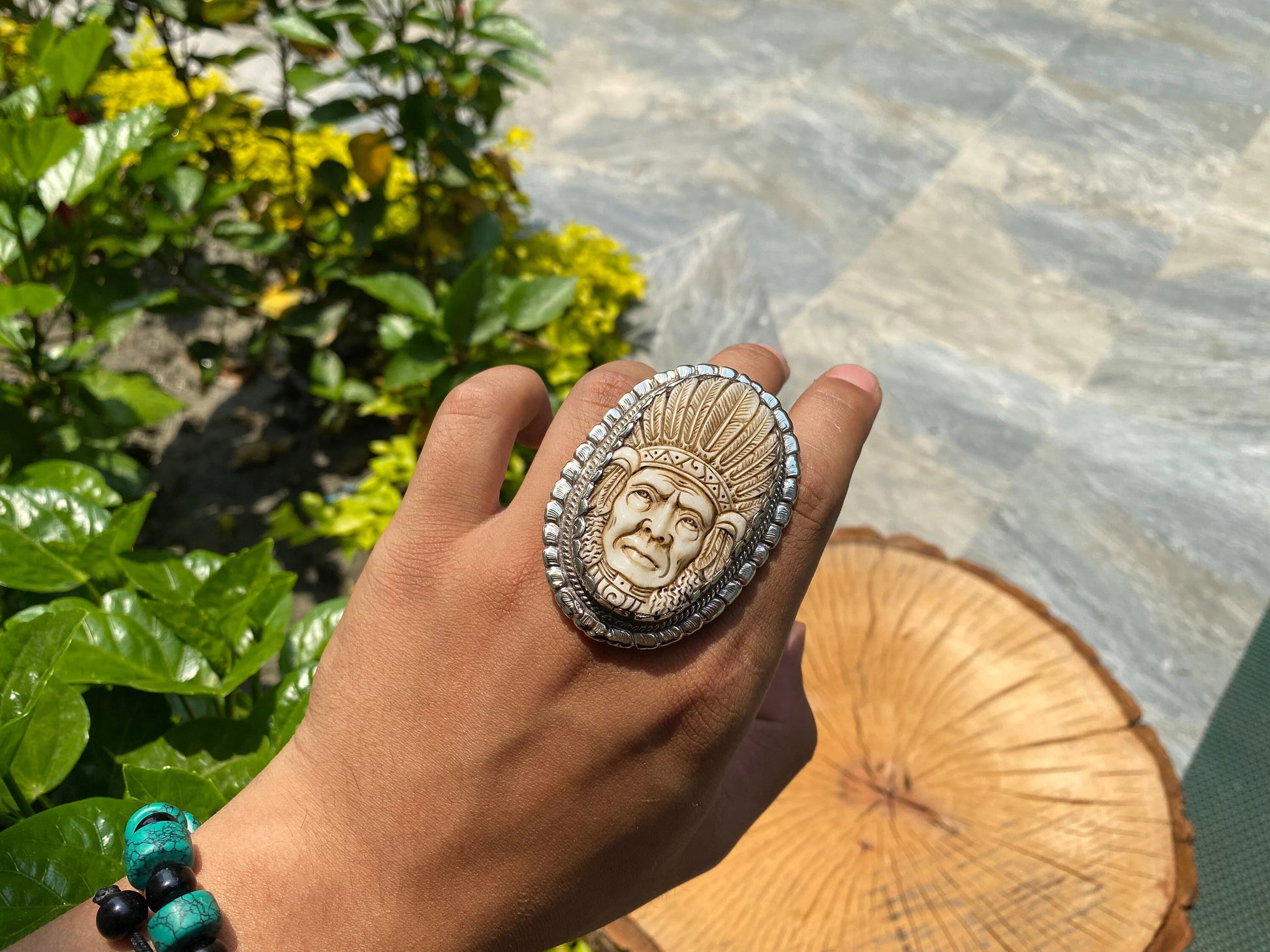 Indian Chief Carving on Buffalo Bone, Tibetan Silver Ring, Adjustable ring.