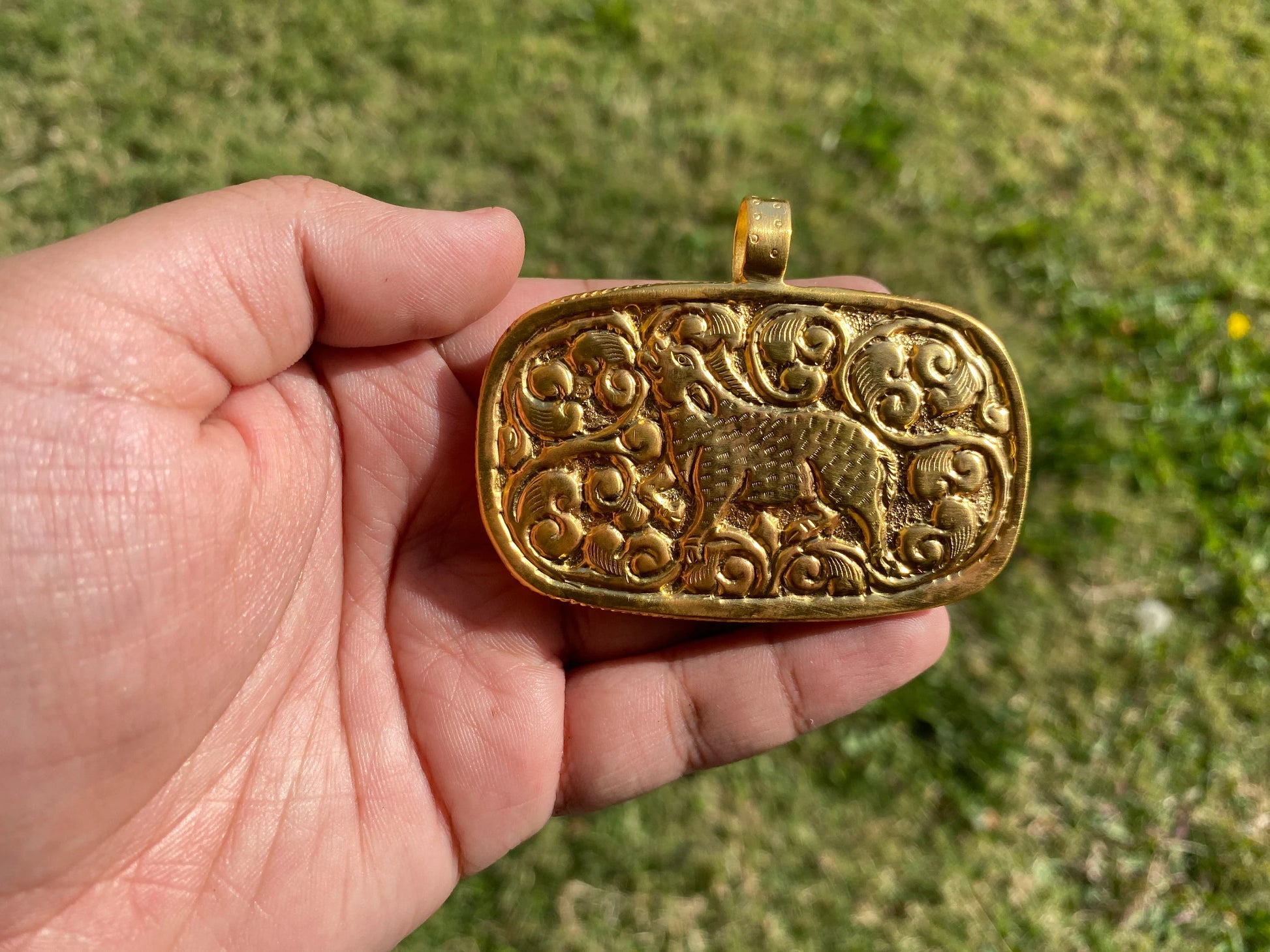 This Gorgeous hand carved buffalo bone pendant made with non tarnish 18K brushed Gold Overlay over brass with a remarkable detail of carving. Hand-carved dear designs on the back side of Pendant. This Tibetan designs pendant is handmade in Nepal and adorned by a beautiful pendant. Perfectly bohemian in style, these tribal beauties come from the Himalayas. Beauty of this pendant that is unmatched as they are handmade and are one of a kind. With the nature of them being handmade, each product is unique in its own right and no two products are the exact same.