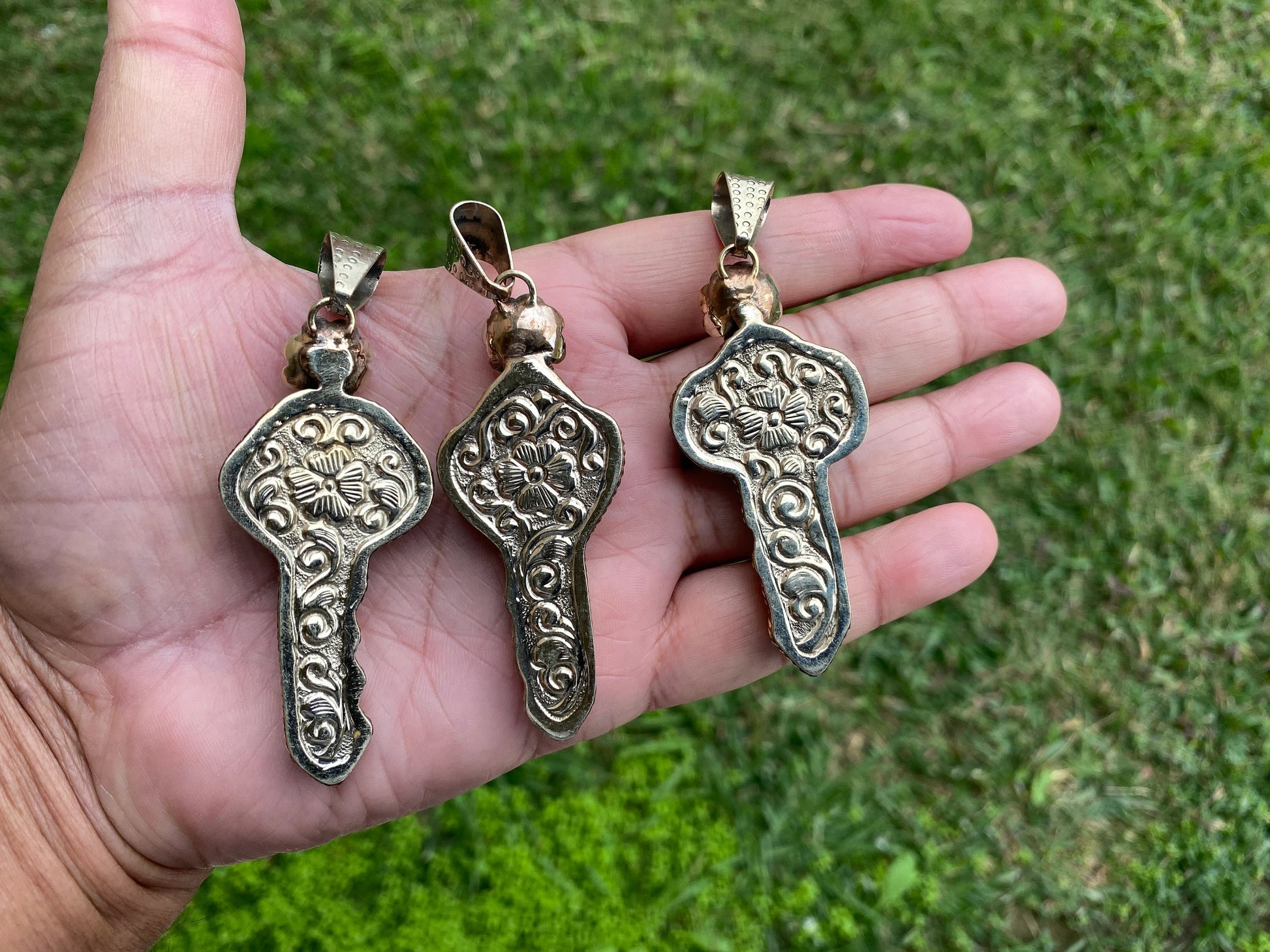 The pendant has a beautiful carving design in the back and the large hanging hole of 9 mm allows you to add thicker threads and leather. These Nepali pendants have a beauty and magic to them that is unmatched as they are handmade in Kathmandu, Nepal and are one of a kind. With the nature of them being handmade, each product is unique in its own right and no two products are the same.
