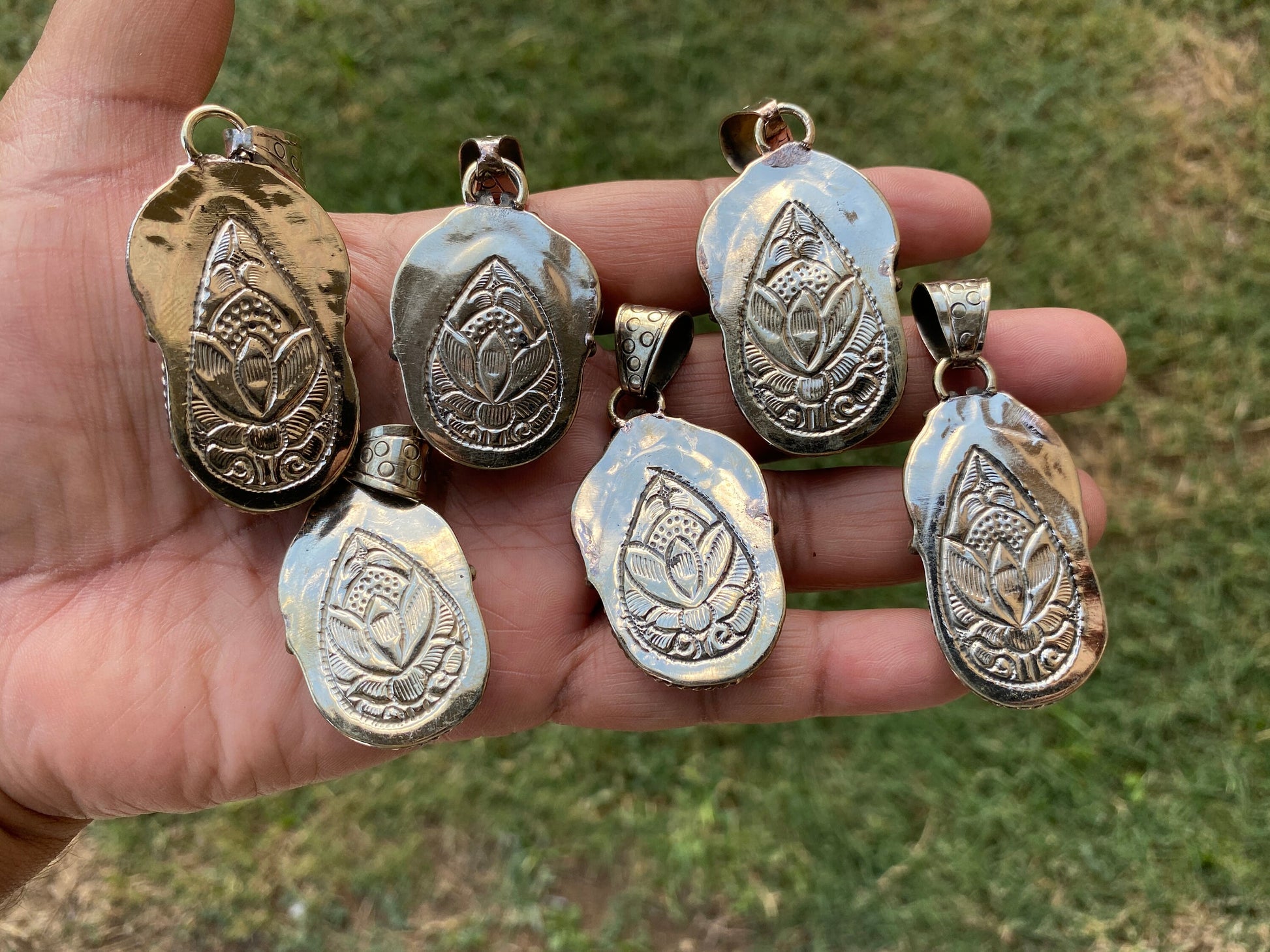 Measurement: # 1- Pendant: approximately Length 68 mm (measuring from bail to bottom), width 28 mm from the widest side, bail size: 10 mm and weight about 20.90 gm.# 2- Pendant: approximately Length 56 mm (measuring from bail to bottom), width 30 mm from the widest side, bail size: 10 mm and weight about 17.40 gm.# 3- Pendant: approximately Length 66 mm (measuring from bail to bottom), width 30 mm from the widest side, bail size: 10 mm and weight about 20.60 gm.# 4- Pendant: approximately Length 58 mm (measuring from bail to bottom), width 25 mm from the widest side, bail size: 10 mm and weight about 16.30 gm.# 5- Pendant: approximately Length 60 mm (measuring from bail to bottom), width 30 mm from the widest side, bail size: 10 mm and weighs about 18.60 gm.# 6- Pendant: approximately Length 62 mm (measuring from bail to bottom), width 25 mm from the widest side, bail size: 10 mm and weight about 18.40 gm.
