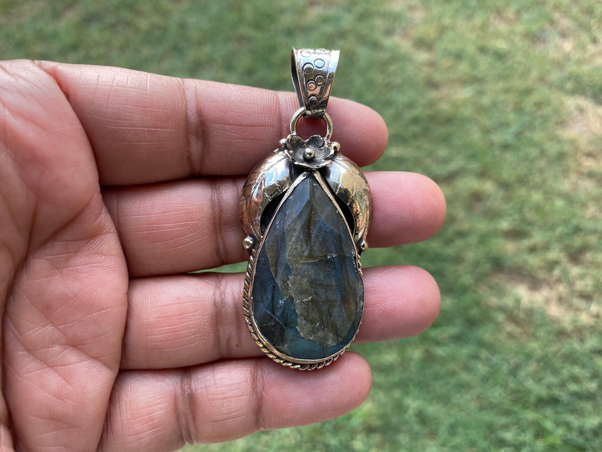 This listing is for 1 piece.At wholesale price!!! This Gorgeous pendant is hand-carved with a remarkable detail. This Tibetan designs pendant is handmade in Nepal and adorned by a beautiful pendant. Perfectly bohemian in style, these tribal beauties come from the Himalayas.Labradorite Pendant Made with...