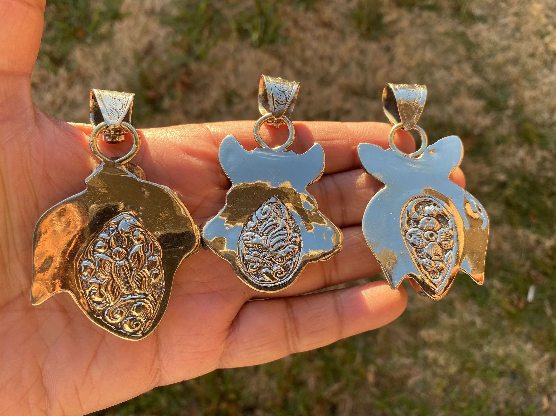 Measurement: Left Pendant: approximately Length 76 mm (measuring from bail to bottom), width 45 mm from the widest side, bail size: 10mm and weight about 29.90 gm.Center Pendant: approximately Length 70 mm (measuring from bail to bottom), width 40 mm from the widest side, bail size: 10 mm and weight about 25.60 gm.Right Pendant: approximately Length 75 mm (measuring from bail to bottom), width 40 mm from the widest side, bail size: 10 mm and weighs about 26.60 gm.