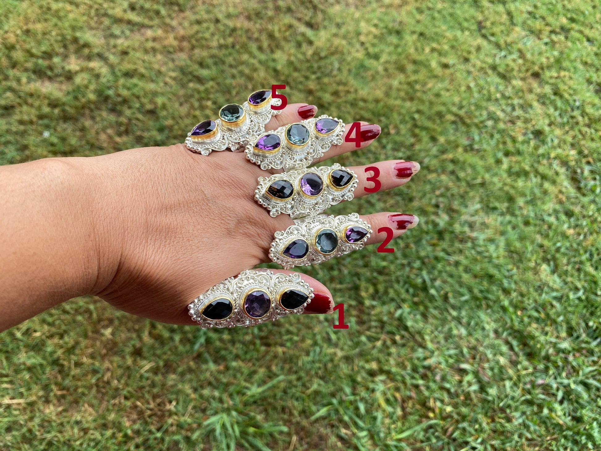 This ring is absolutely stunning. It is a great statement piece. Beautiful natural gemstone. You will receive the exact ring shown in the pictures. This high quality durable statement piece ring is handmade in Nepal. Beauty of this ring that is unmatched as they are handmade and are one of a kind. With the nature of them being handmade, each product is unique in its own right and no two products are the exact same.