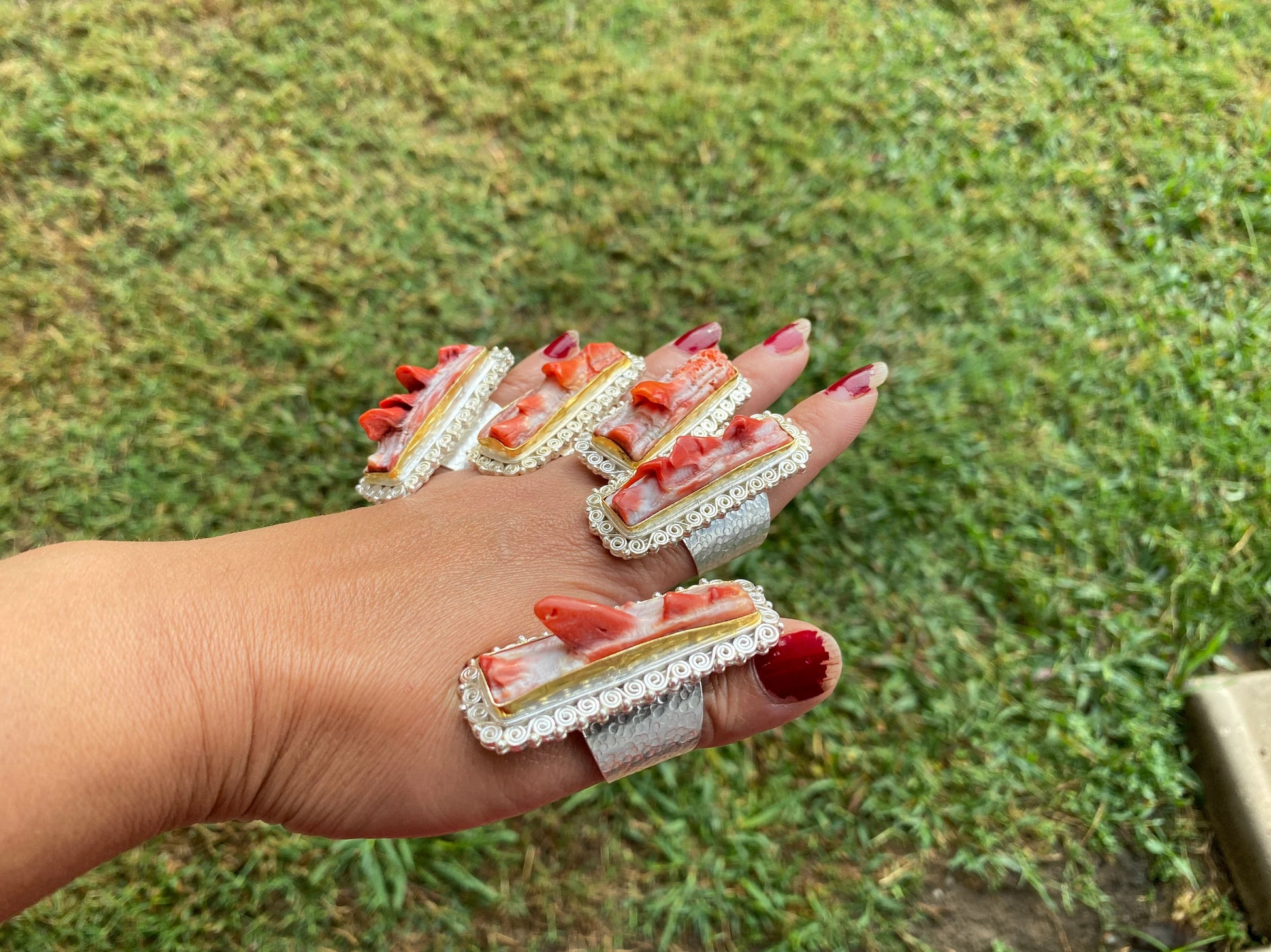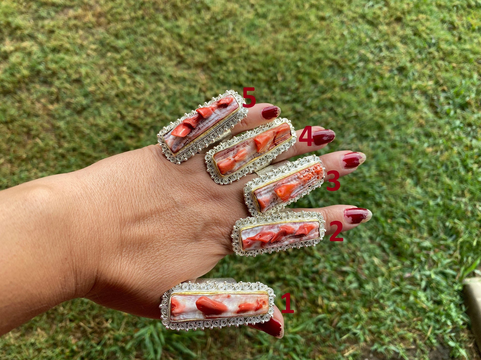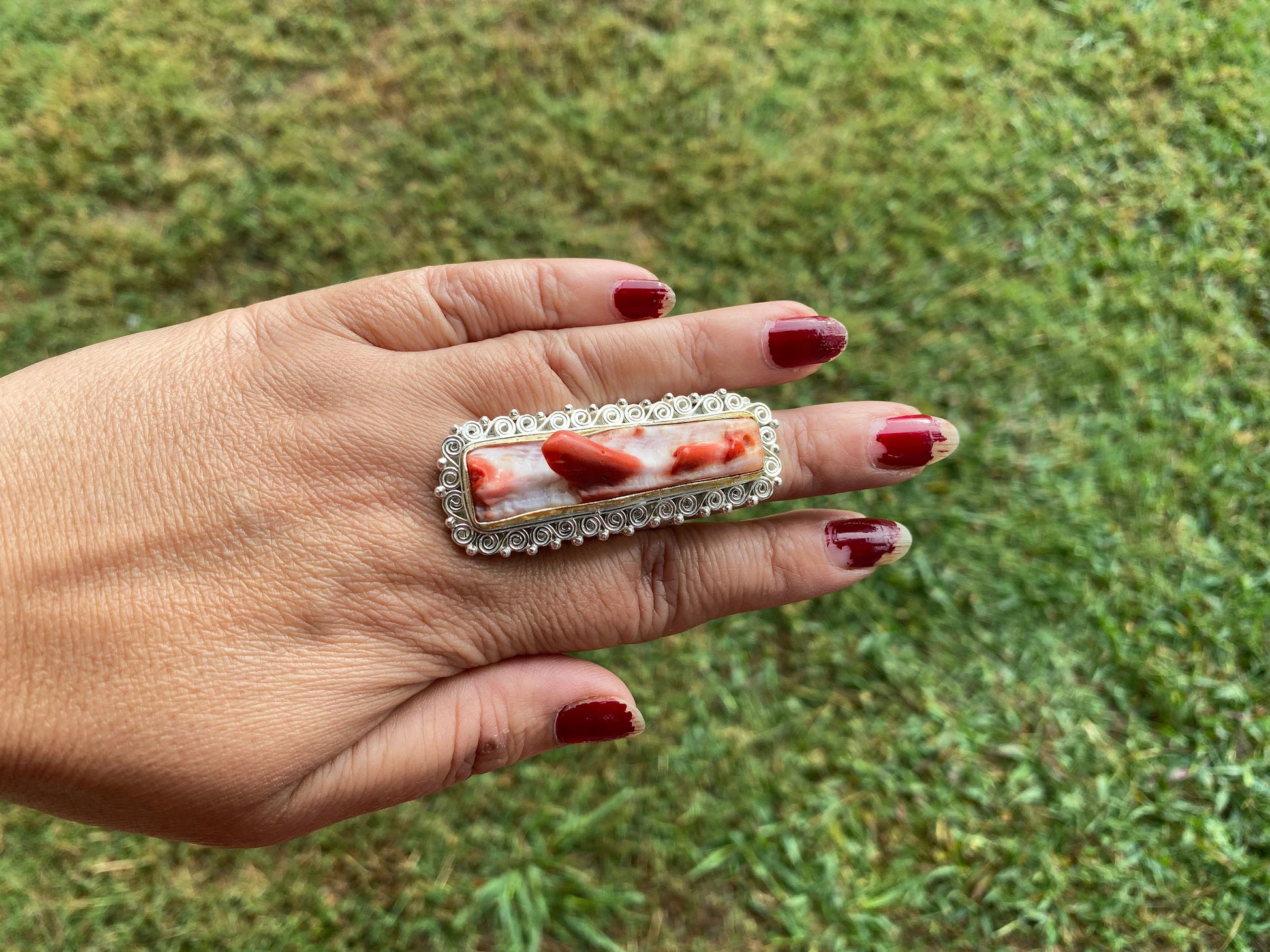 Ring Size: Adjustable (One size fits most) can adjust one size up or downStone: Spiny Oyster ShellMeasurements: Approximately 60 mm X 18 mm, Weight: 32.50 gm