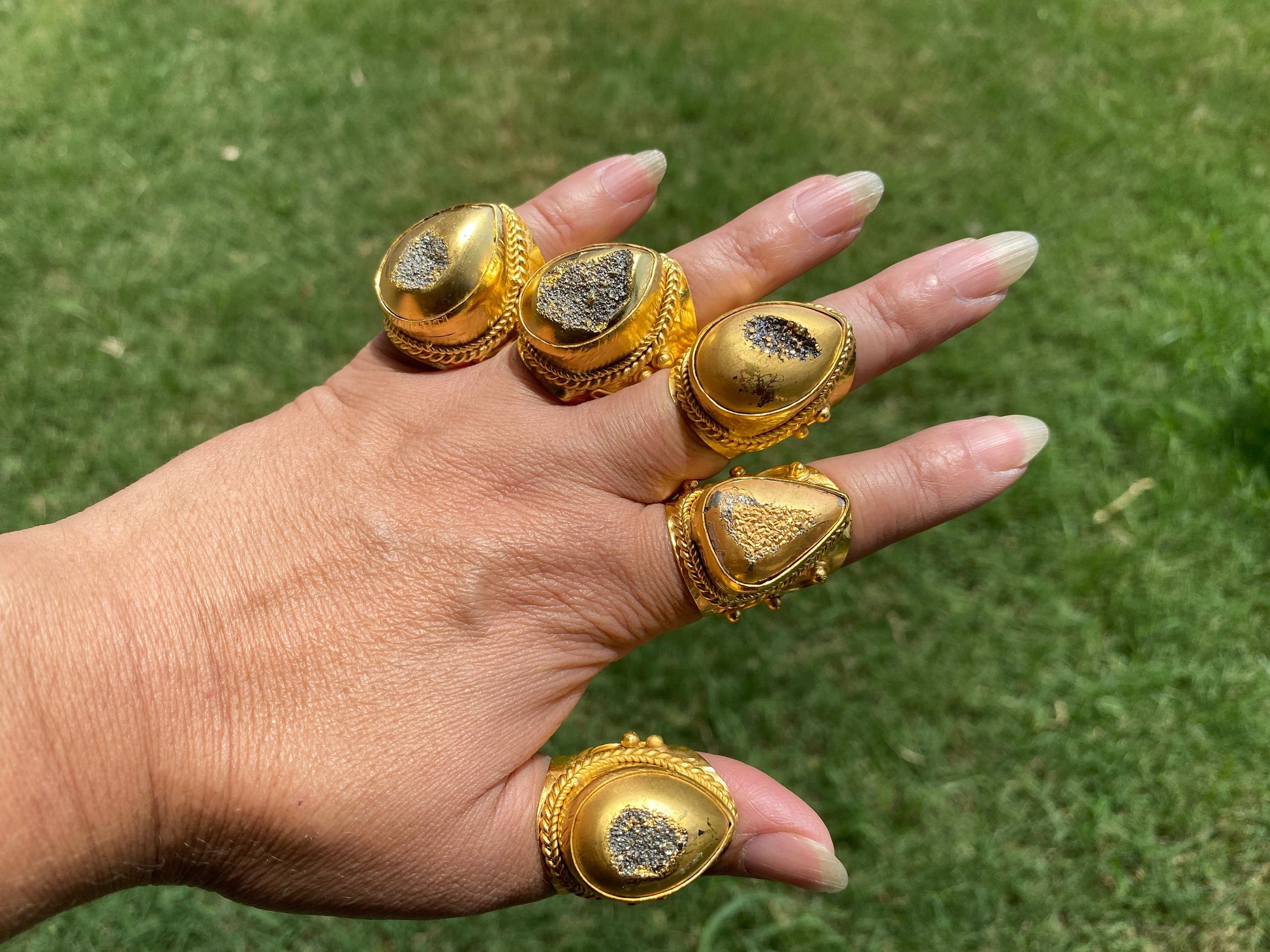 This listing is for 1 piece.At wholesale price!!!This is High Quality Druzy ring is absolutely stunning with beautiful hammered adjustable band. You will receive the exact ring shown in the pictures.This high quality durable statement piece ring is handmade in Nepal. Beauty of this ring that is unmatched as they are handmade and are one of a kind. With the nature of them being handmade, each product is unique in its own right and no two products are the exact same. Made with 18k matte Gold overlay over brass with Anti tarnish finish.