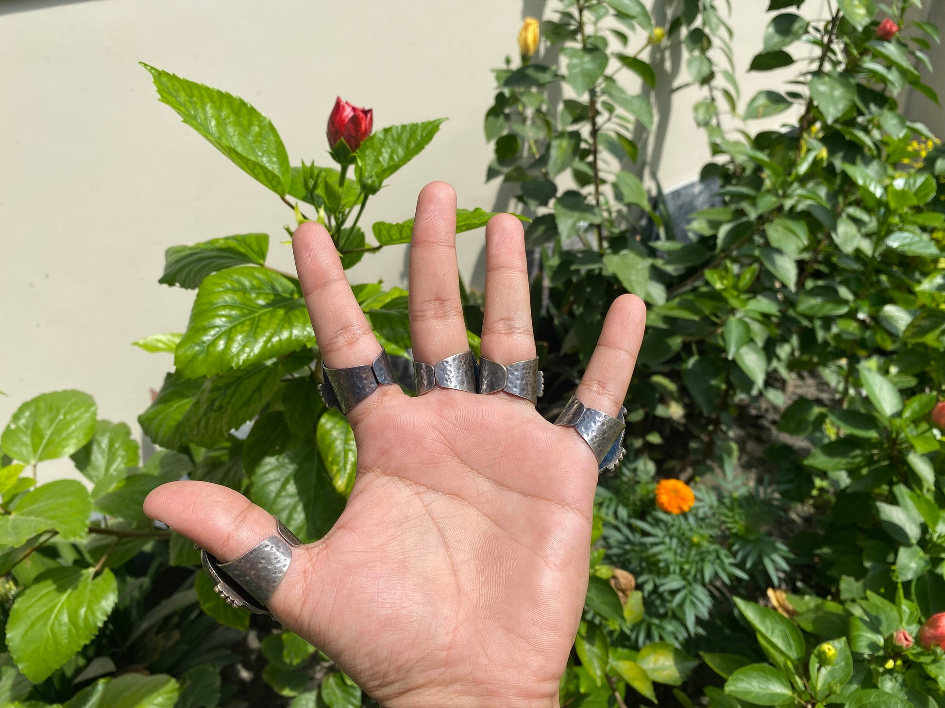 This is a handmade ring featuring a beautiful turquoise with Spiny Oyster stone set in silver overlaid on brass from Nepal. Its hammered texture adds to the rustic, bohemian charm and makes it perfect for daily wear. The adjustable design provides comfort with the bold statement of wearing it. Ideal for any casual or special occasions, this unique ring combines traditional craftsmanship with a modern style.